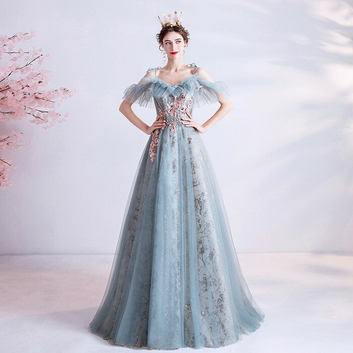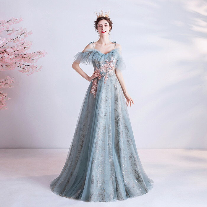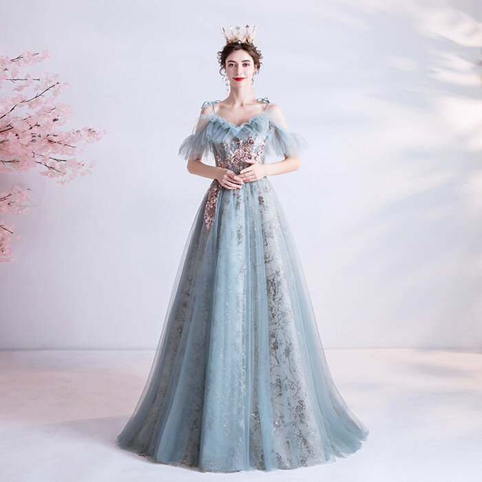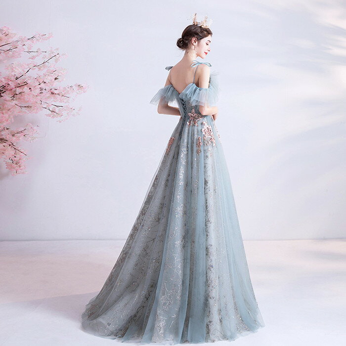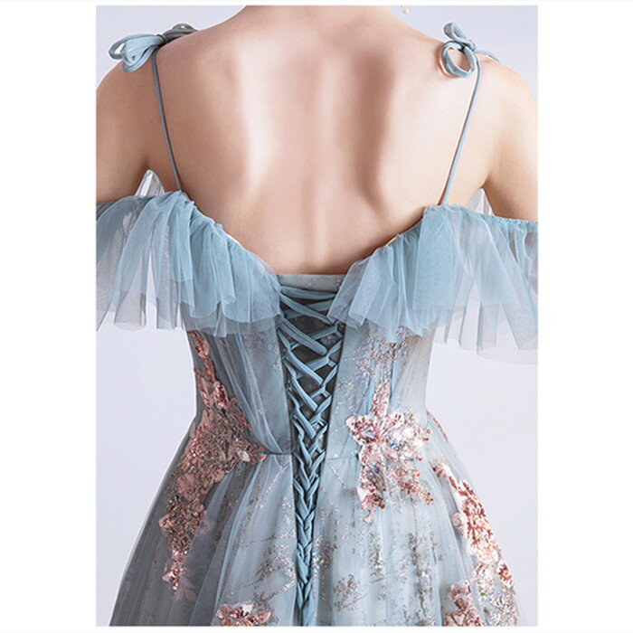 前撮りドレス ウェディングドレス【着後レビュー特典】ラッフルカラー ブルーグレー 刺繍 キャミ ドレス 胸元フリル 肩リボン ロングドレス カラードレス くすみカラー ワンピース 二次会 お色直し パーティードレス 演奏会 ピアノ 発表会