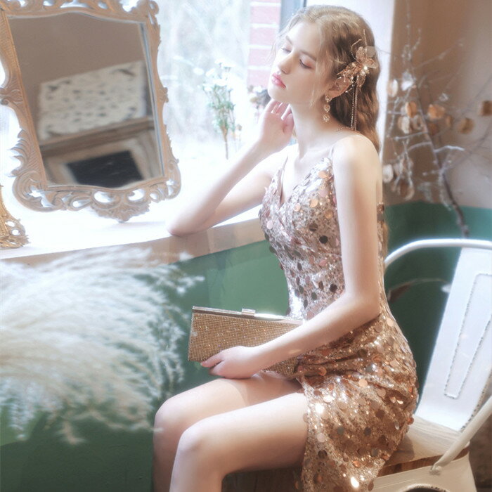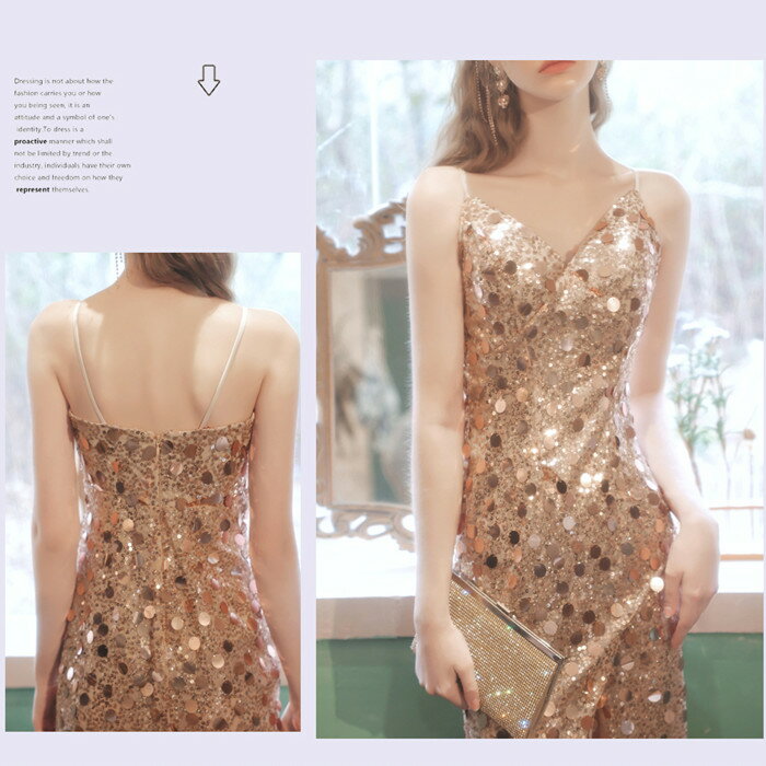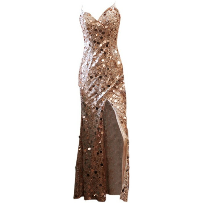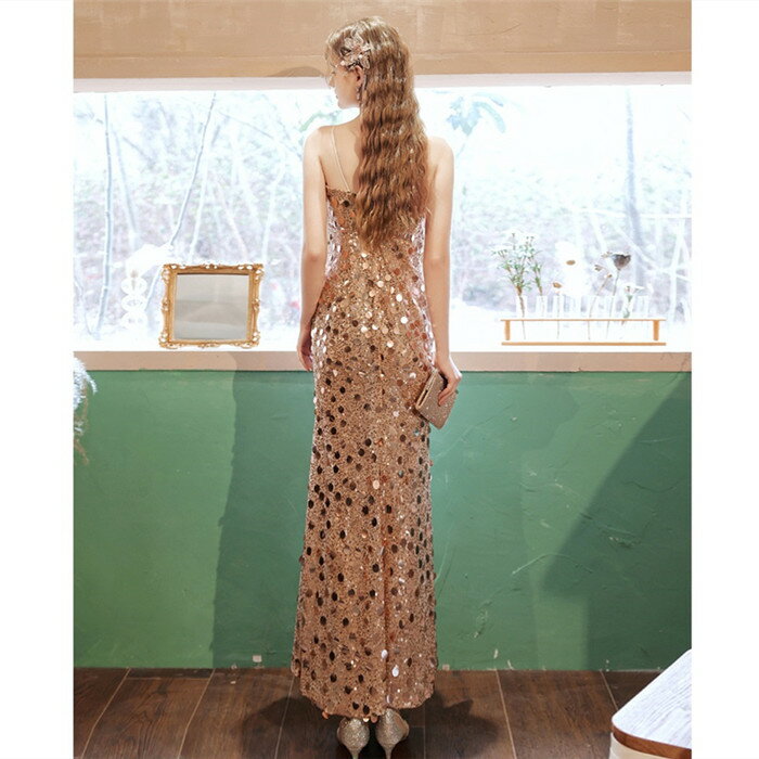 カラードレス ロング お色直し【着後レビュー特典】キラキラ輝くスパンコールが目を引く サイドスリットがセクシー キャミソールロングドレス キャミドレス ゴールド インポート ワンピース ウェディング ドレス XS S XL XXL XXXL 披露宴 刺繍