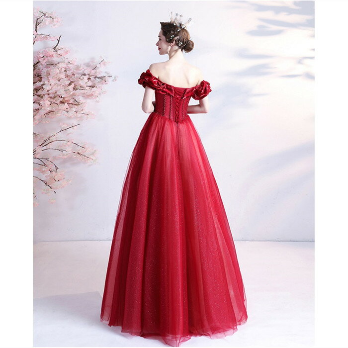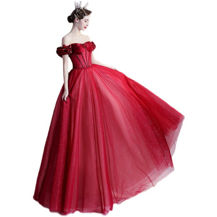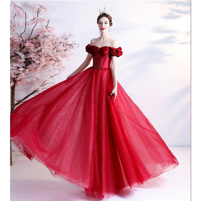 前撮りドレス カラードレス ロング お色直し【着後レビュー特典】バラの花びらを思わせる ショルダーデザインのふんわりシルエットの Aラインロングドレス オフショルダー レッド 真っ赤 インポート ワンピース ウェディング ドレス XS S XL XXL XXXL 披露宴 刺繍