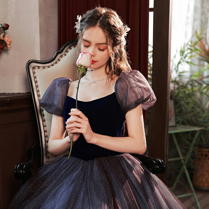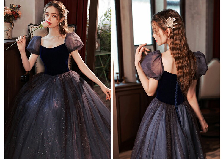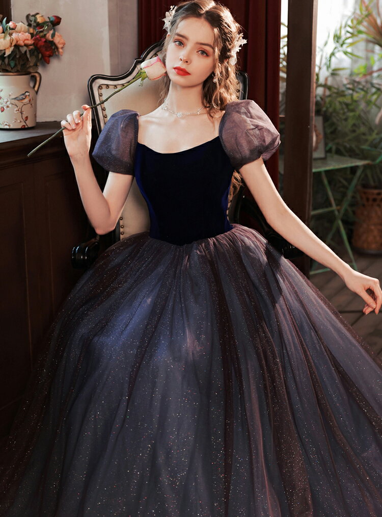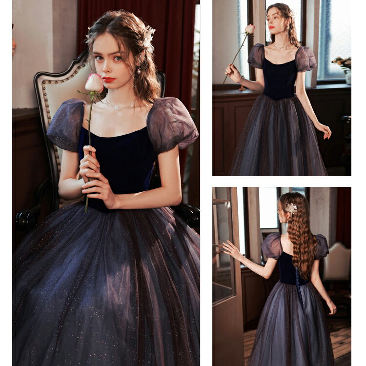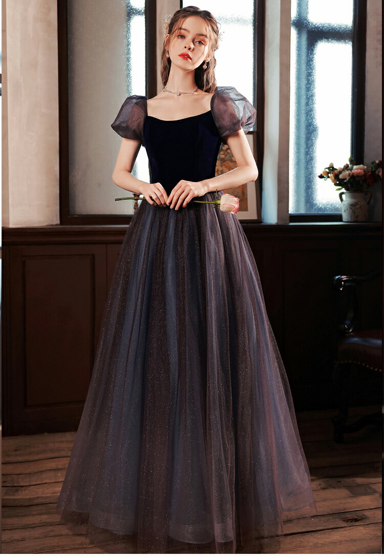 前撮りドレス カラードレス お色直し【着後レビュー特典】ふわふわのチュールが可憐なパフスリーブ Aライン スクエアネック ラメ シンプル かわいい ロングドレス ブラック 黒 パフ袖 インポート ワンピース ウェディング ドレス XS S XL XXL XXXL 披露宴 刺繍