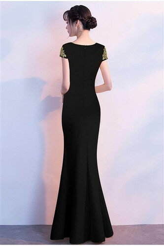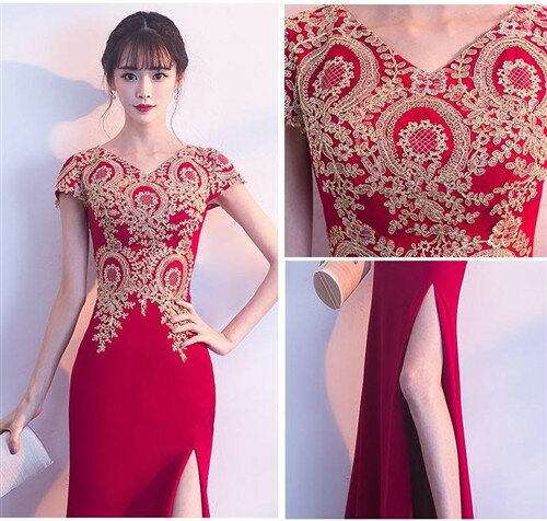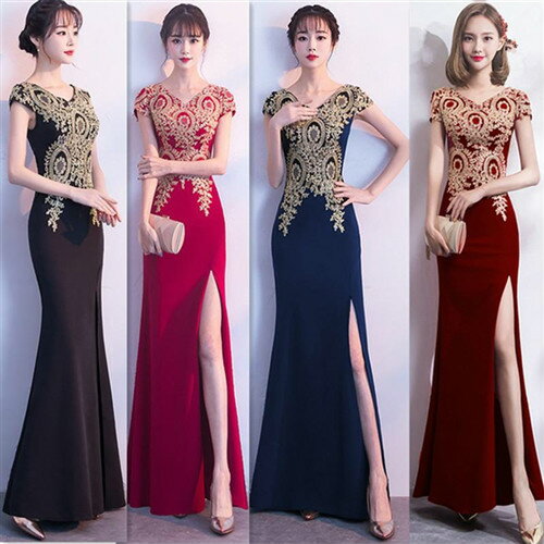 ロングドレス キャバドレス キャバワンピ エレガントな胸元金糸レース装飾デザイン セクシースリットストレッチロングドレス全4色(ブラック レッド ネイビー ワイン)