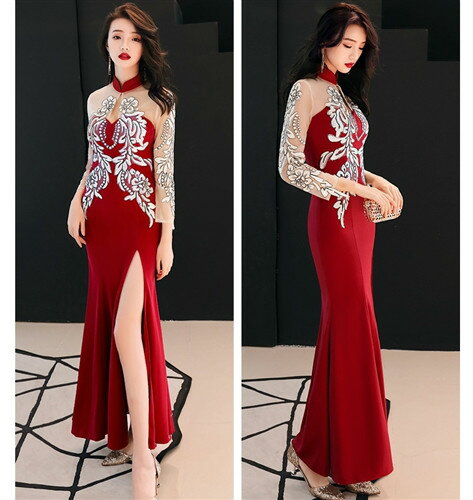 即納 ロングドレス キャバドレス キャバワンピ エレガントな胸元レース装飾デザインにセクシーな長袖メッシュうレース切替 セクシースリットストレッチロングドレス全4色(ブラック レッド)