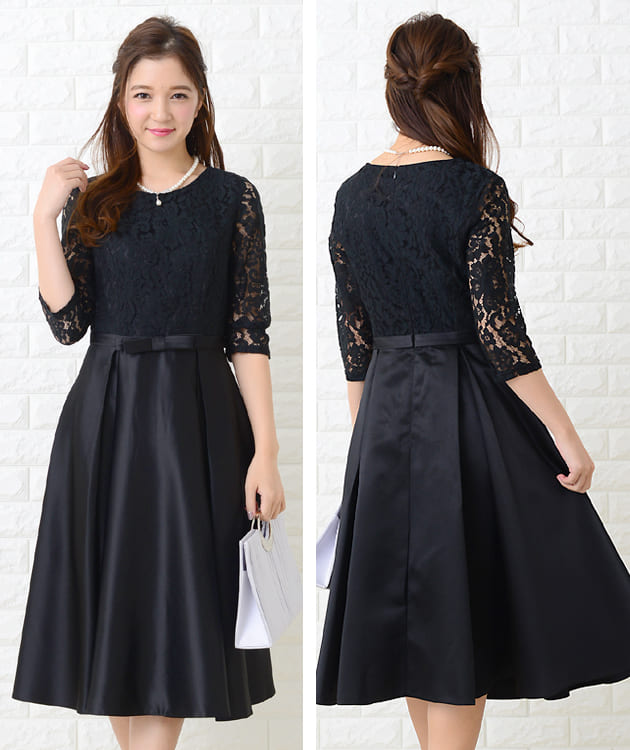 パーティードレス 切り替えワンピース Aライン ウエストリボン 七分袖 ブラック ネイビー レディース 袖付き 膝下丈 結婚式 二次会 お呼ばれ 披露宴 卒業式 入学式 花柄 レース 大きいサイズ 20代 30代 40代 黒 紺 春 夏 秋 冬 他と被らない