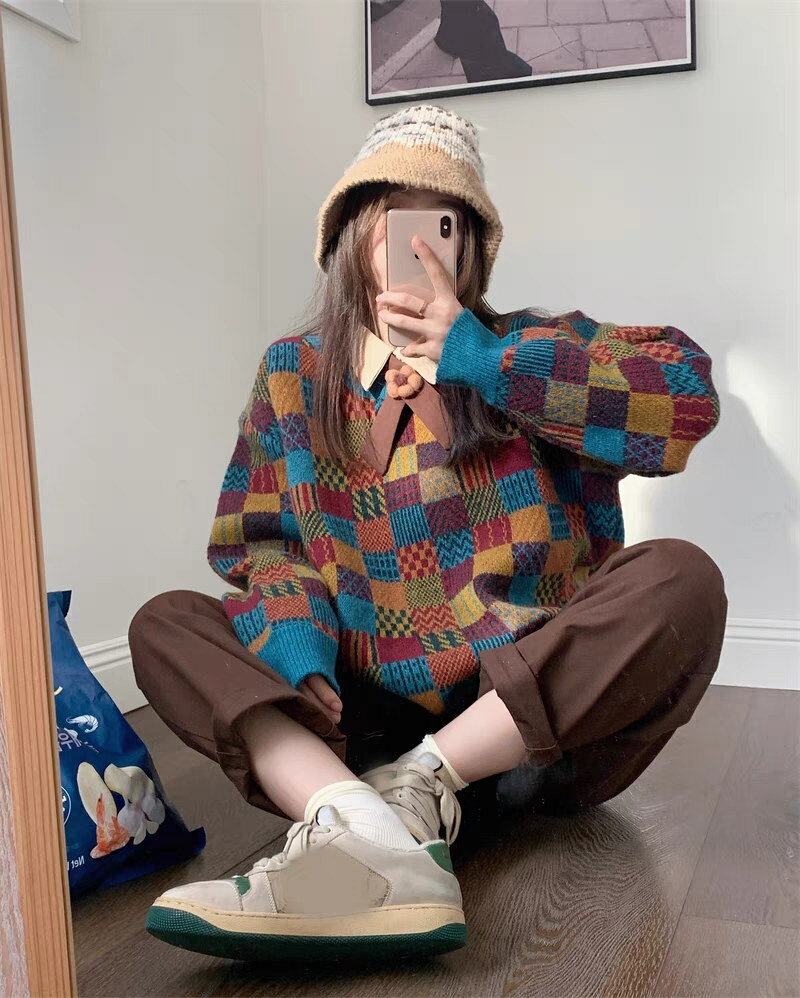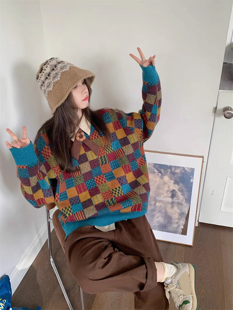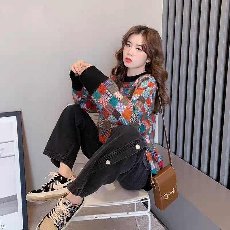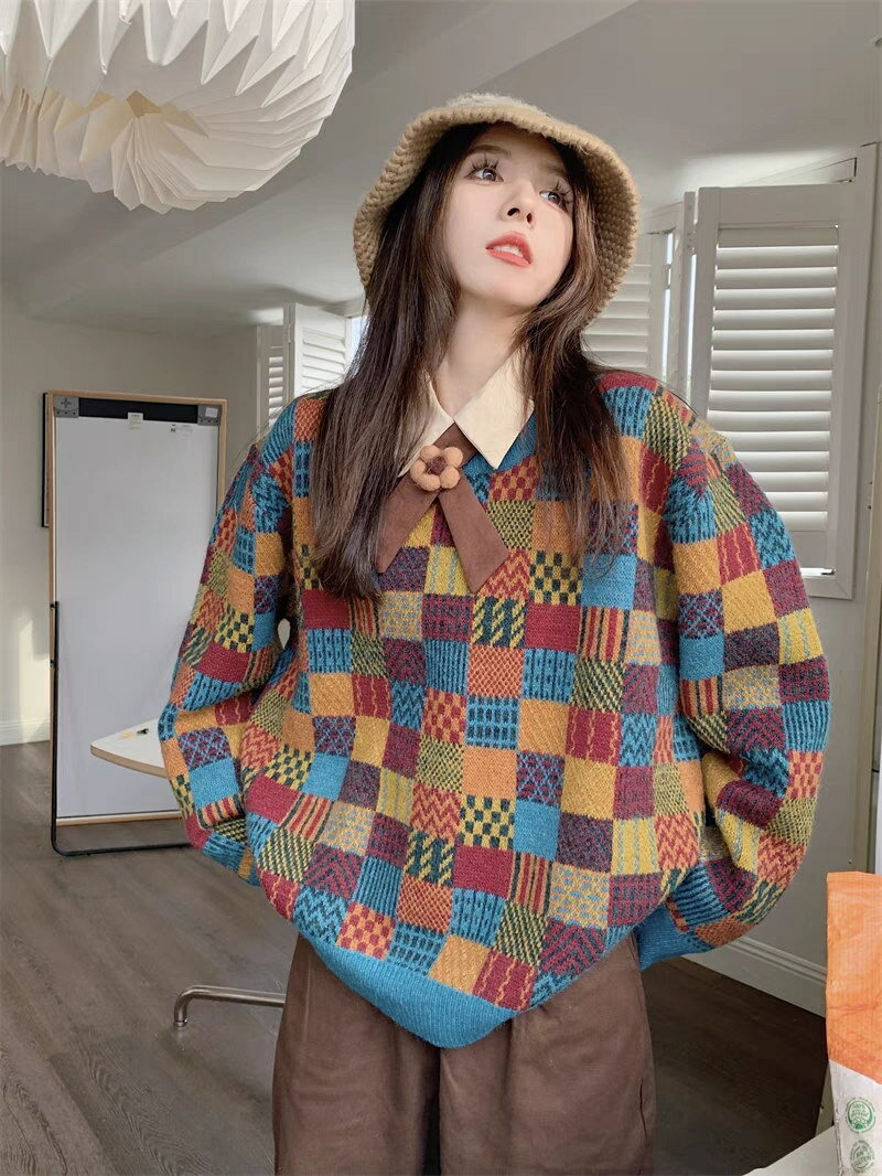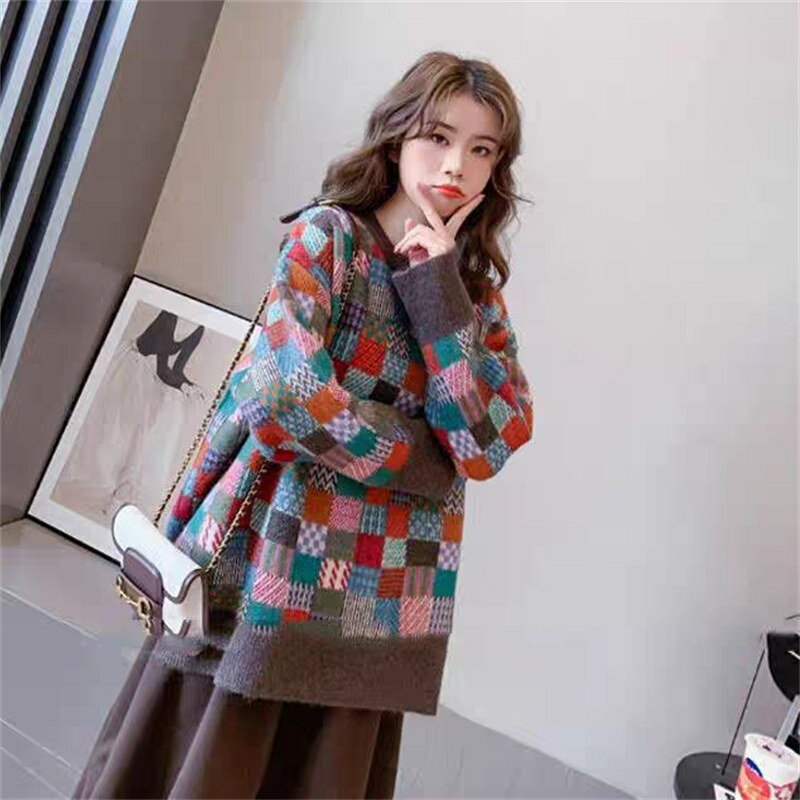 【即納】ニット トップス レディース セーター ニットセーター チェック柄 秋冬 チュニック ニットソー プルオーバー オーバーサイズ アウター 大きいサイズ セーター ドルマン 柔らかい お洒落 配色 可愛い ゆったり 防寒 ニットソー