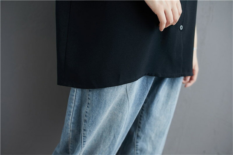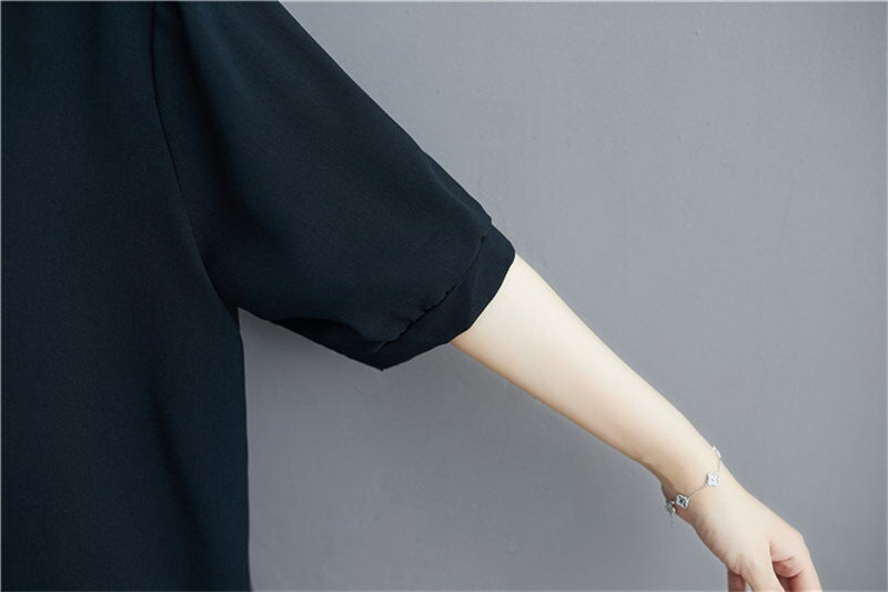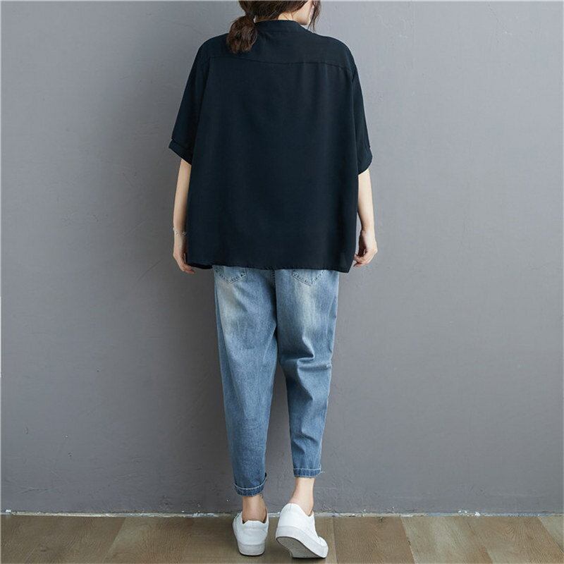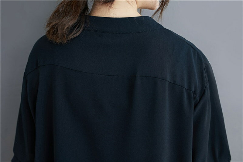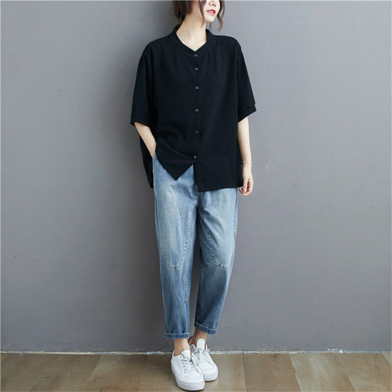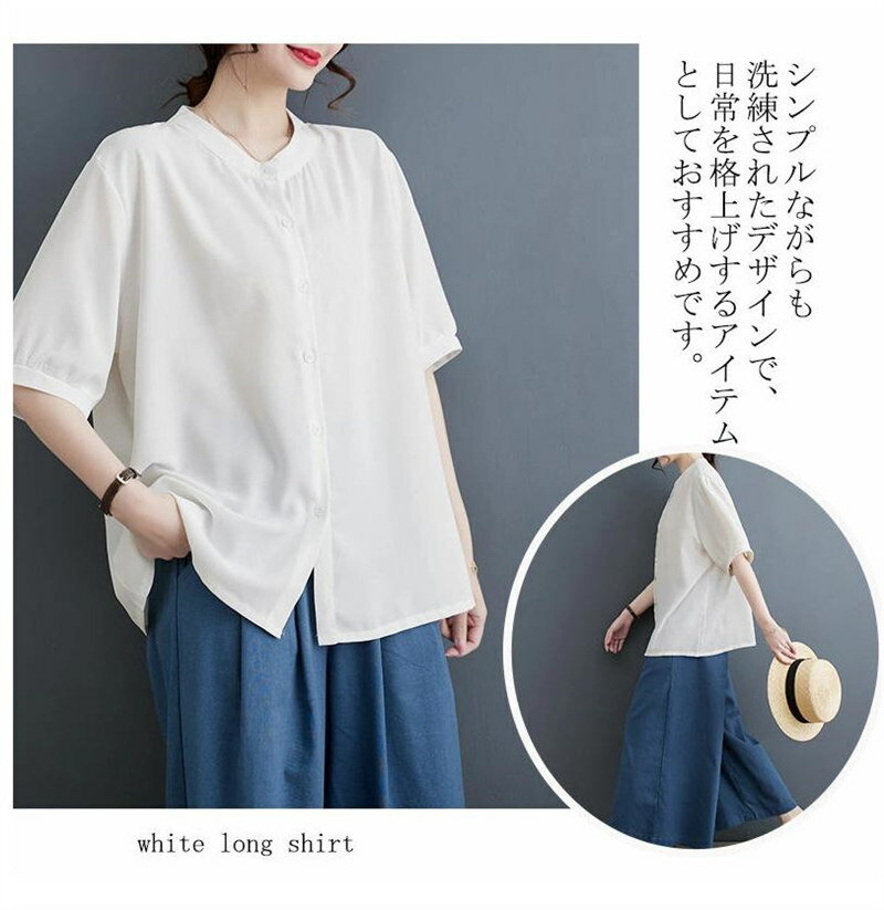 【翌日発送】半袖シャツ シャツ トップス レディース 5分袖 夏 シャツブラウス 大きいサイズ 体型カバー ゆったり ブラウス 七分袖 チュニック 薄手 通気性 白シャツ ホワイトシャツ 前開き ゆるっと ロングシャツ ラウンドネック 涼しい リラックス 黒 紺色 カジュアル