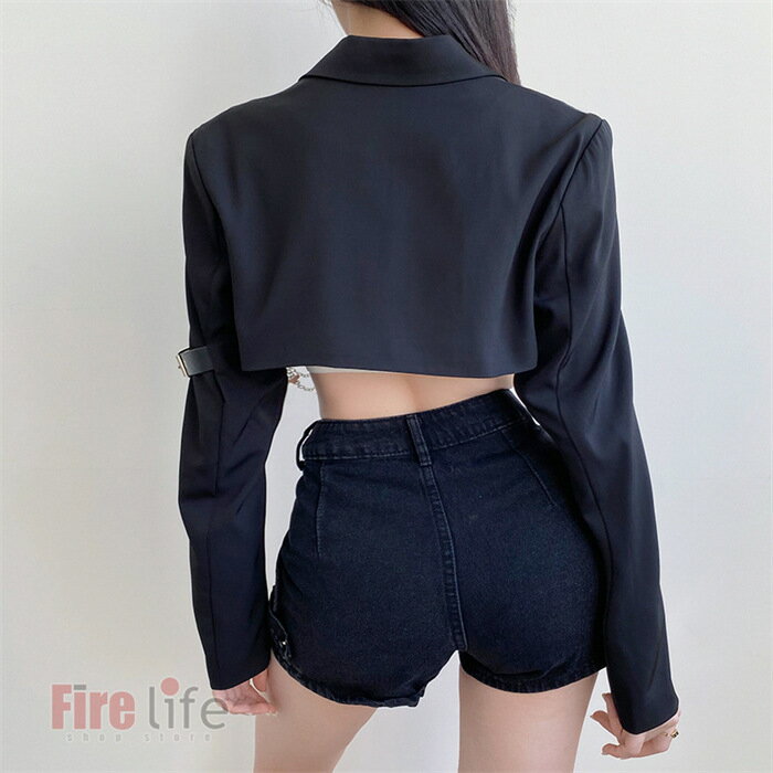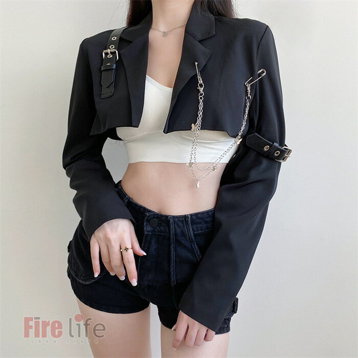 ダンス衣装 スーツジャケット レディース ショートジャケット チェーン付き 黒ステージ衣装 ダンストップス ヒップホップ K-POP ブラック 舞台衣装 原宿 へそ出し イベント おしゃれ カッコイイ送料無料