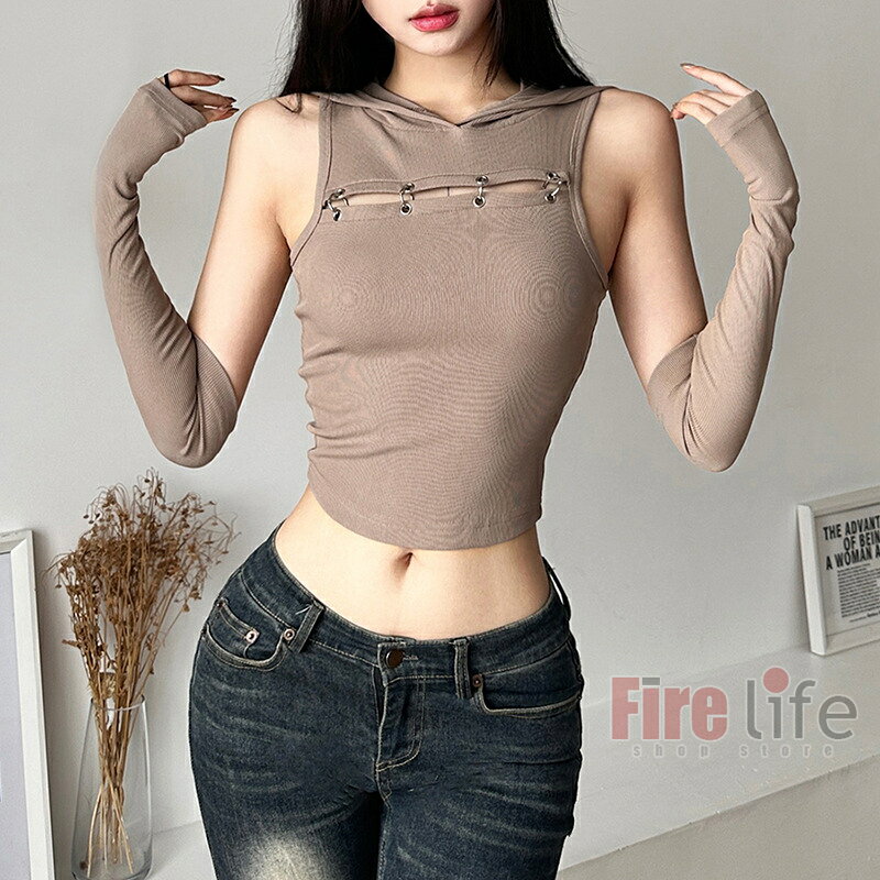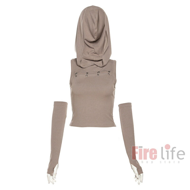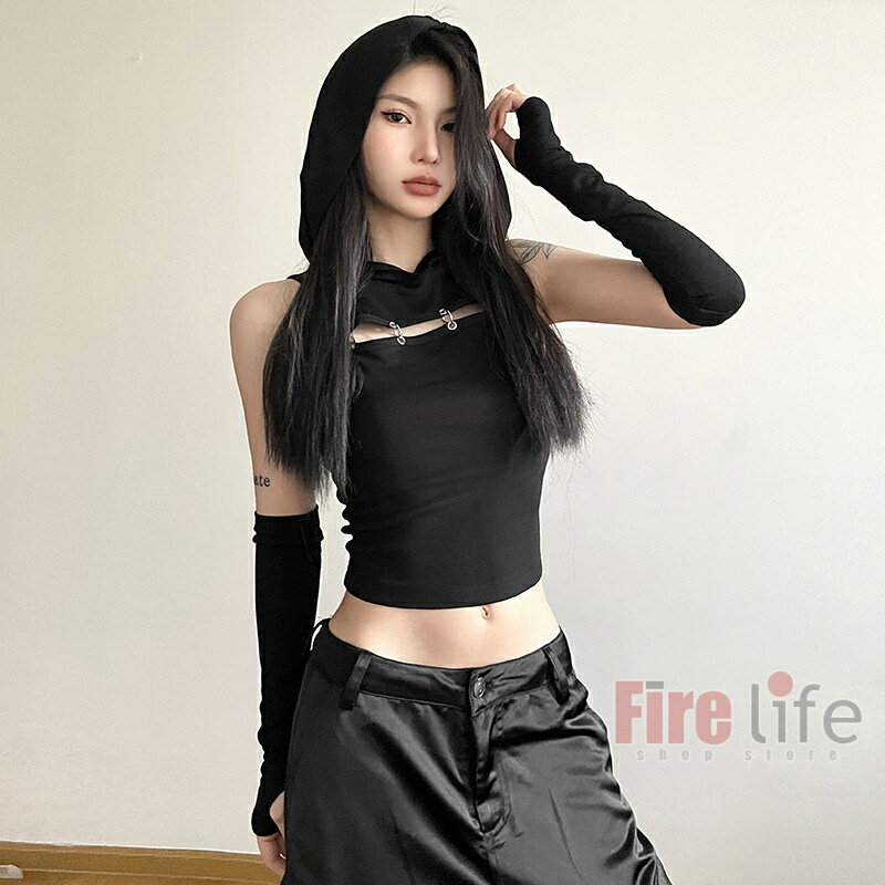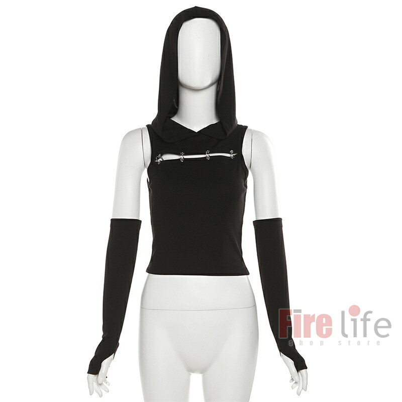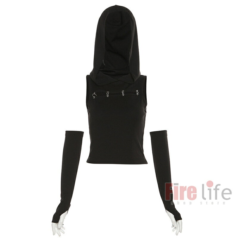 ダンストップス レディース フード付き 袖カバー付き タンクトップ ブラック へそ出し ショート丈 無地 ヒップホップ セクシー ジャズ 韓舞 ステージ衣装 送料無料