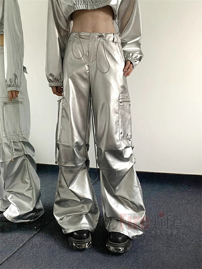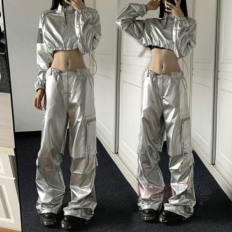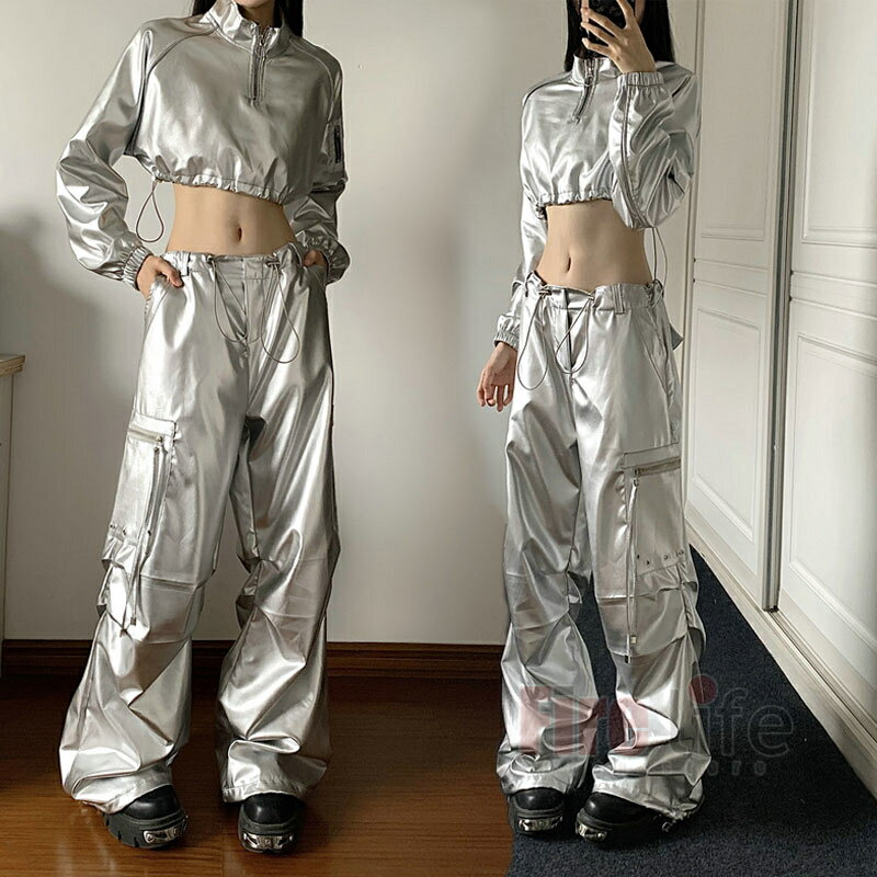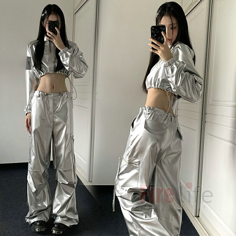 ダンス衣装 レディース 銀色パーカー 長袖 へそ出し トップス シルバー ショート丈 個性 ロングパンツ PU ヒップホップ ダンスウェア ジャズダンス K-POP 韓国 演出服 ステージ衣装 jazz 団体服 送料無料