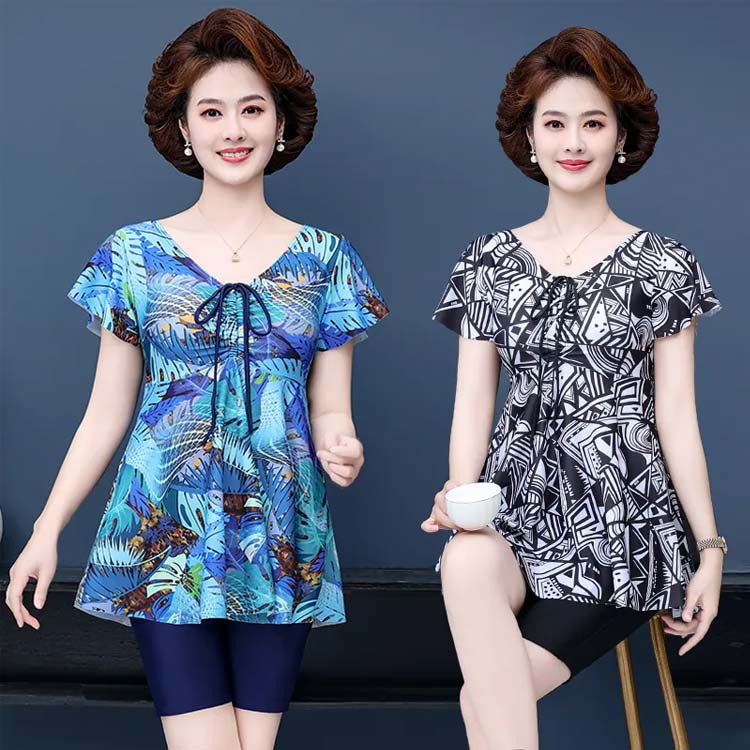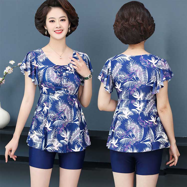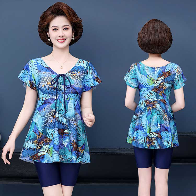 水着 ワンピース ショートパンツ シニア セット レディース セパレート 体型カバー おしゃれ スイムウェア UVカット ママ水着 保守 中高年 温泉 お母さん 海 ブルー 温泉 着痩せ 露出控えめ スイムキャップ