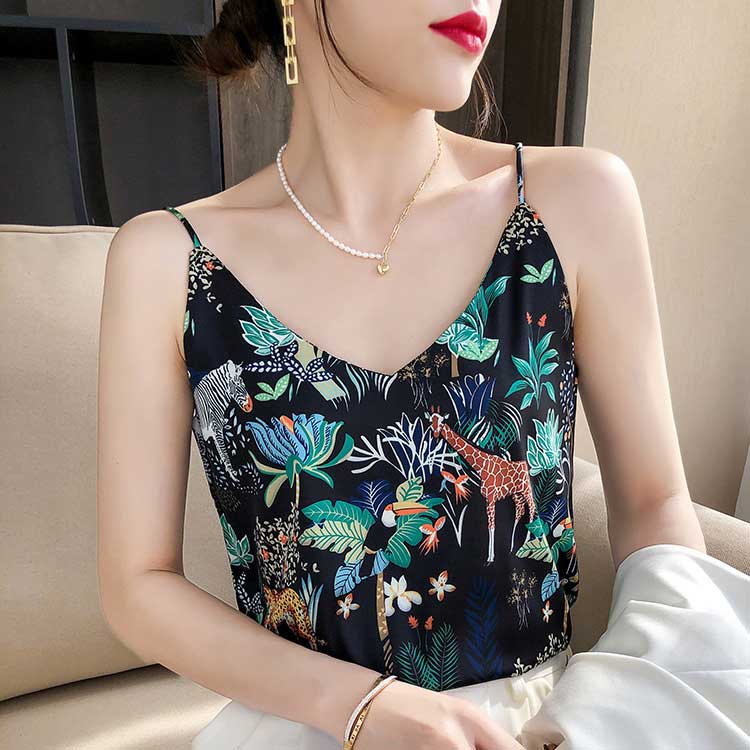 ゆったり 夏 キャミソール 細 上品 サテン プリント レディース ストラップ インナー シルク タンクトップ Vネック ショート丈 ブラウス 重ね着 ノースリーブ 部屋着 透けない 光沢感 高品質 敏感肌 保温 吸湿 通気性 シルク 高級感 大きいサイズ