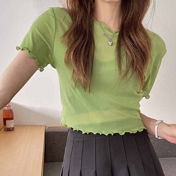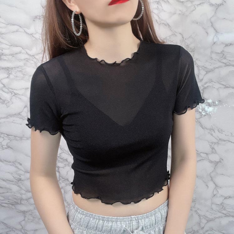 二の腕 半袖 着痩せ インナー 透け感 Tシャツ 付け袖 ショート丈 フリル袖 シアー 薄手 体型カバー フリル レース トップス クルーネック トップス 二の腕カバー レイヤード 細見え 上品 ホワイト ブラック UV対策 冷房対策 春 重ね着