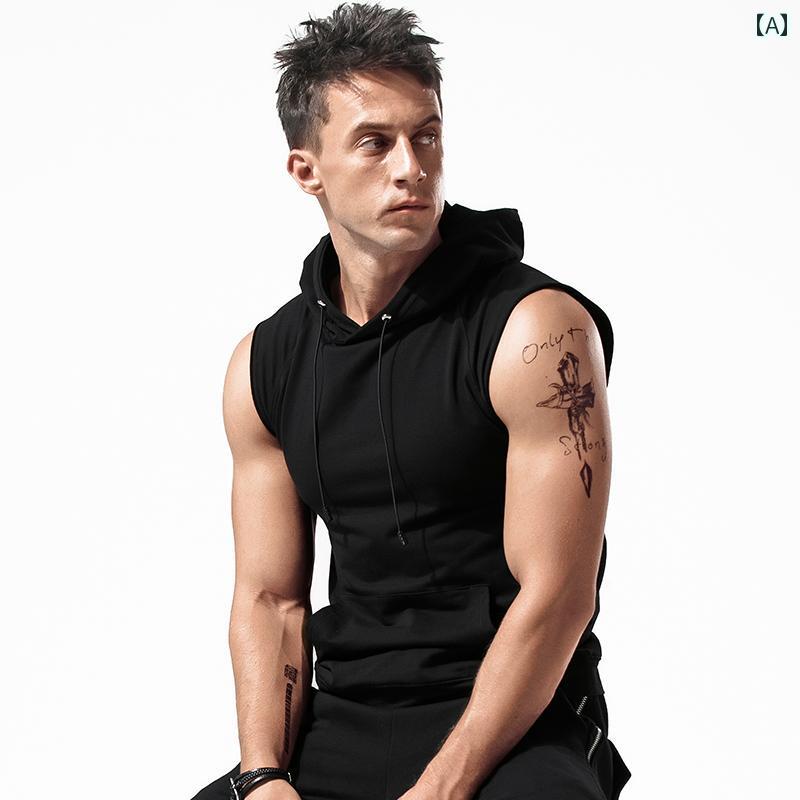 タンクトップ メンズ おしゃれ フード付き ノースリーブ 綿 夏 トレーニング ランニング ジム 無地 シンプル 動きやすい 通気性 柔らかい 白 黒