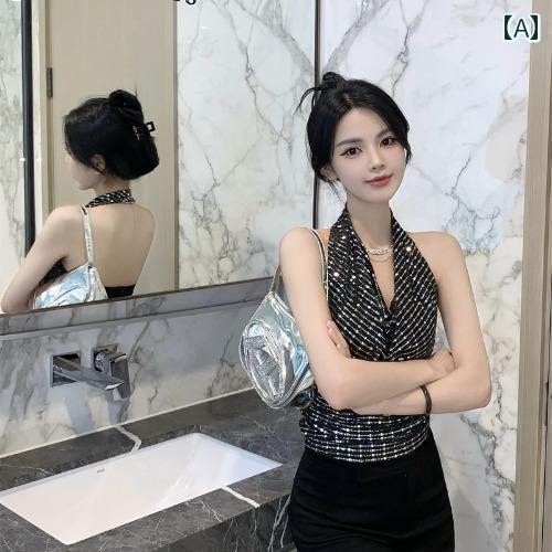 スパンコール トップス ホット ガール レディース ホルター キャミソール 夏 ショート タイト スリム フィット 痩身 細身 黒 シルバー