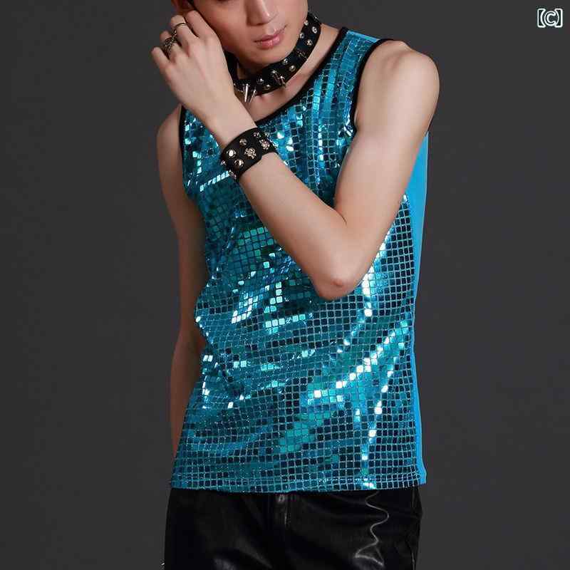 ステージ 衣装 バンド タンクトップ ノースリーブ メンズ 男性 歌手 スリム スパンコール キラキラ パフォーマンス 舞台 ファッション 薄手 派手 赤 銀 青