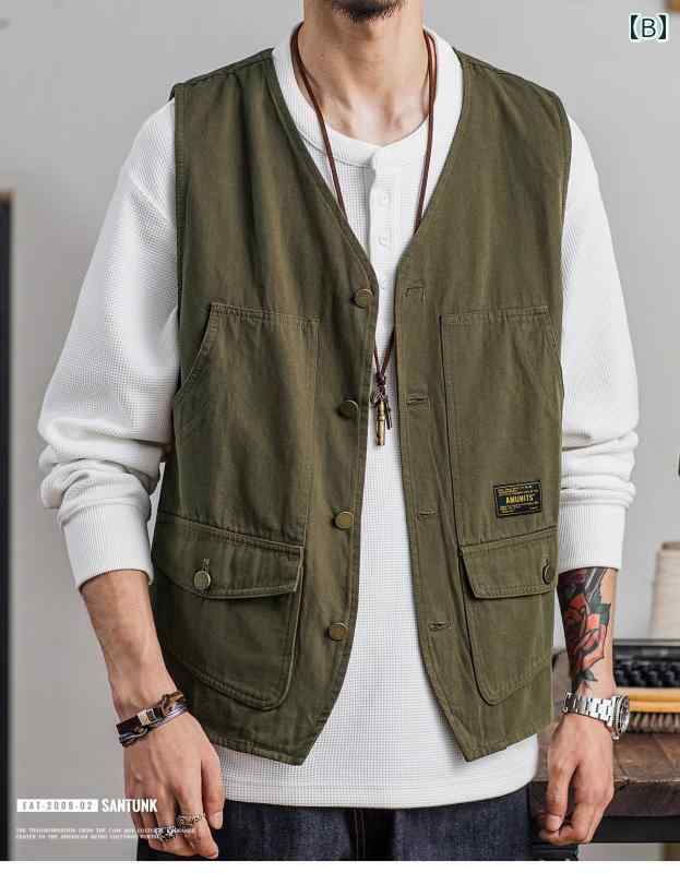 メンズ ベスト カジュアル マルチ ポケット ノースリーブ 多機能 夏 薄手 Vネック シングル アウトドア シンプル おしゃれ ジャケット レジャー ゆったり 大きいサイズ 黒 緑