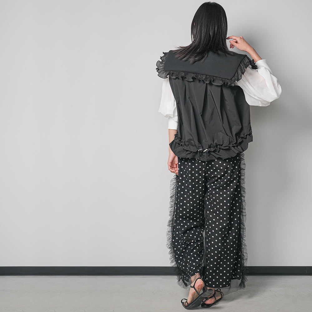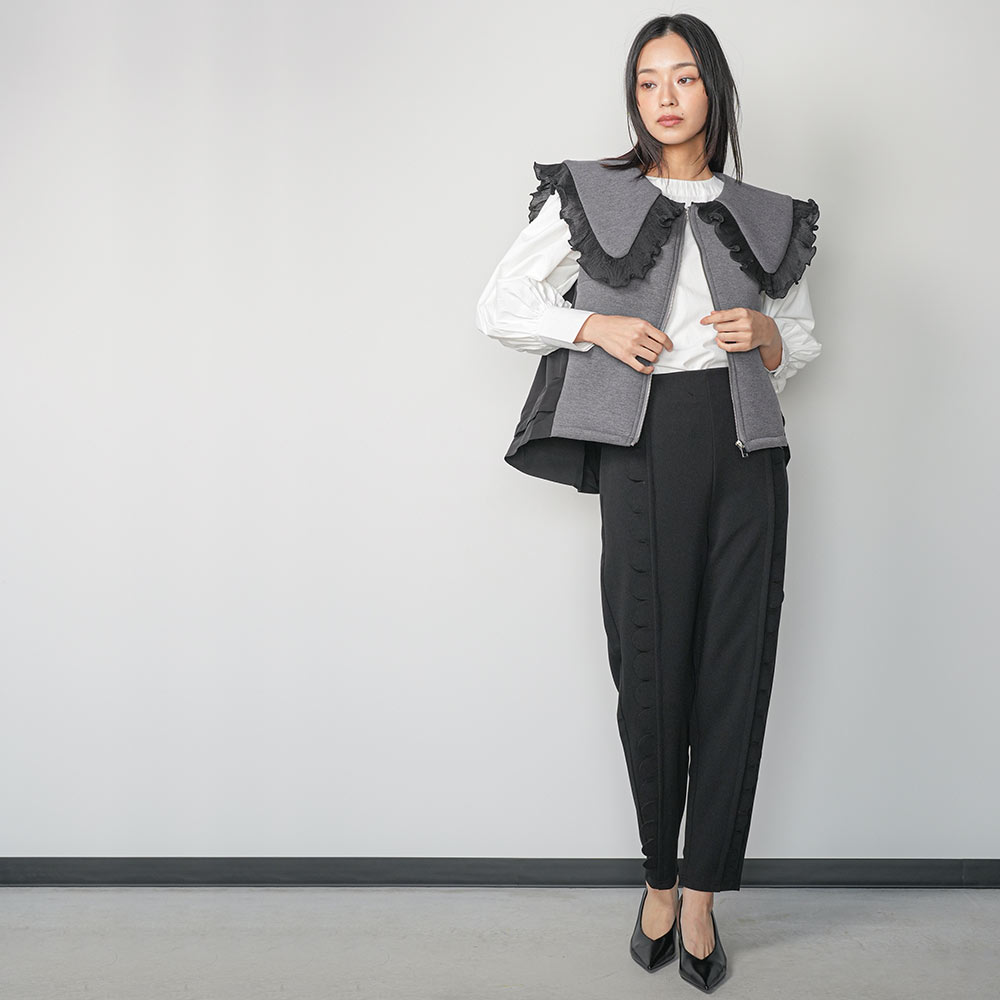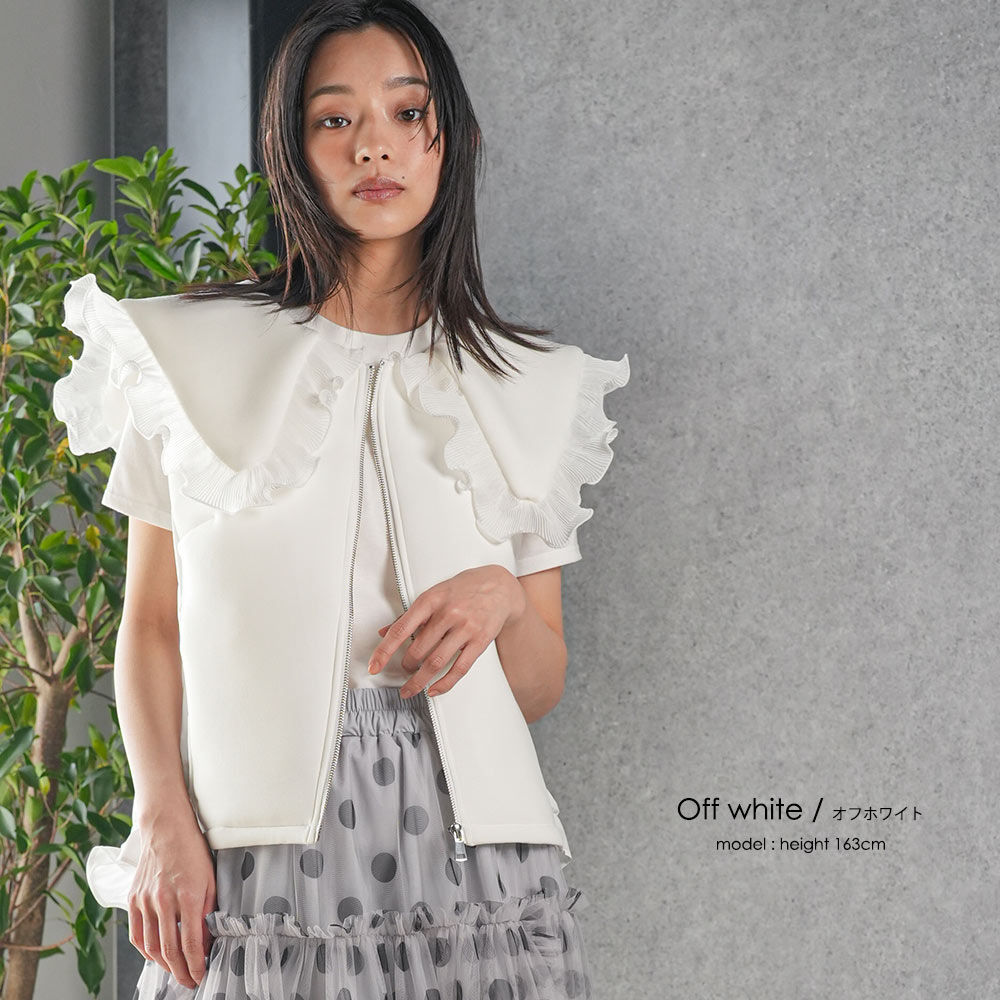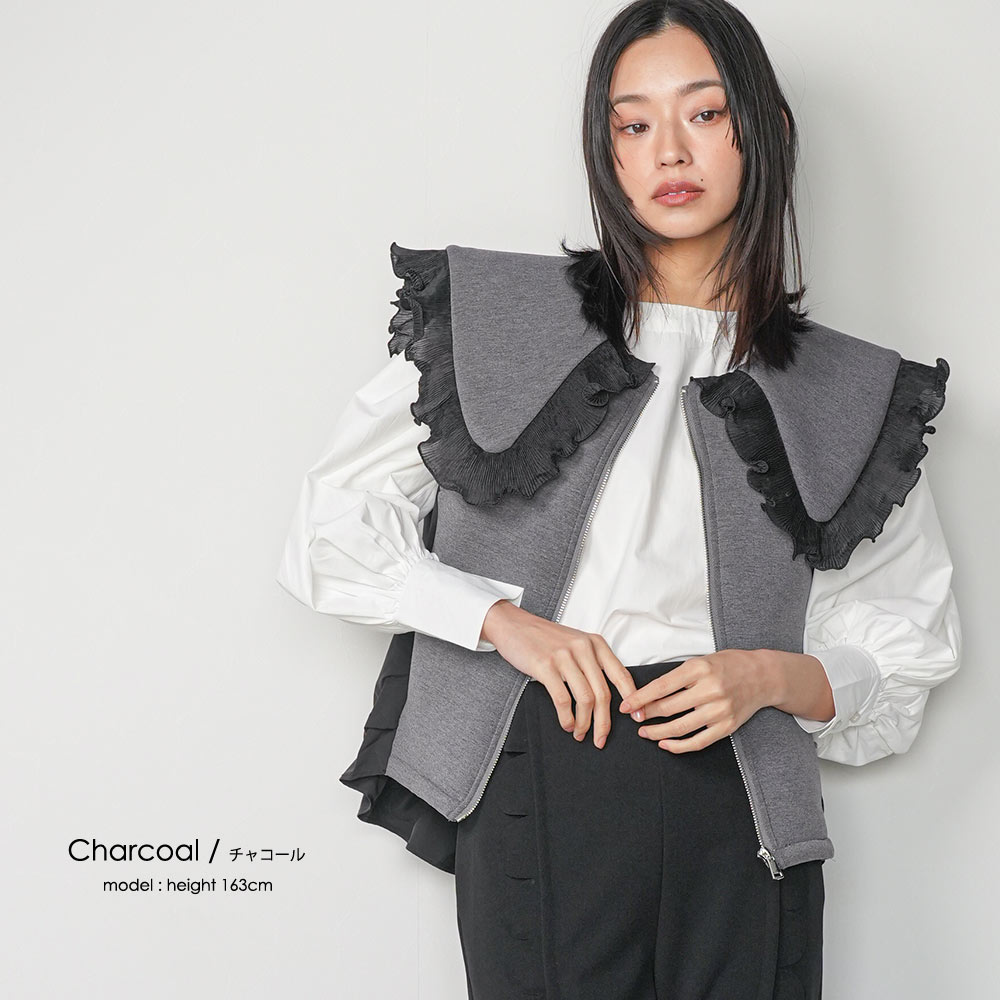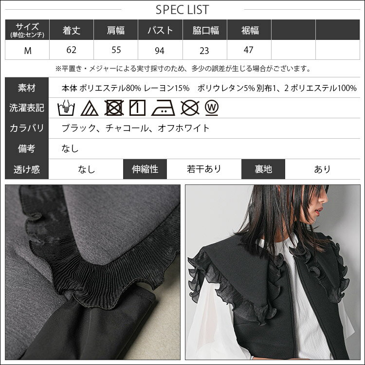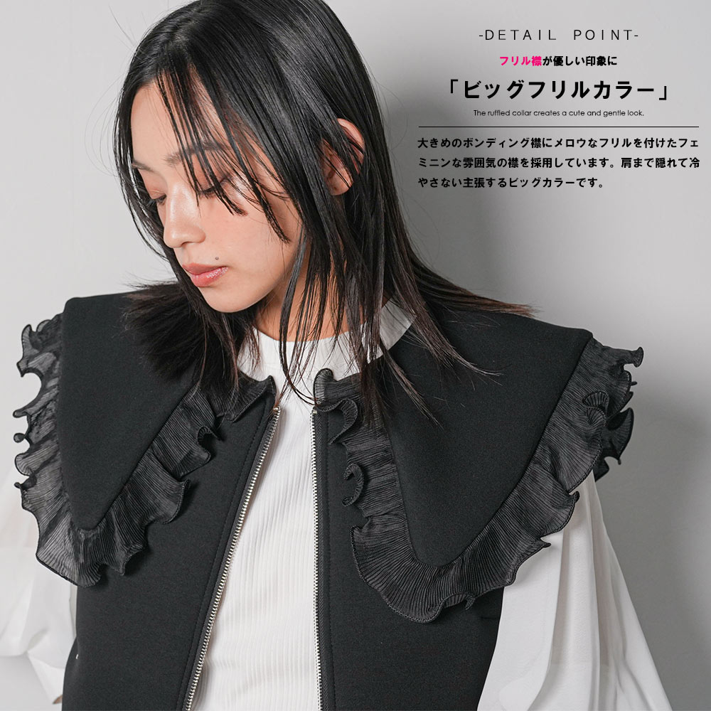 【17%OFFクーポン☆】レディース ベスト ボンディングショットベスト ボンディング素材 フリル襟 異素材切替 ジップアップ アウター レディース 春 秋 冬 M L 長袖 白 グレー 黒 M 無地 ミリアンデニ