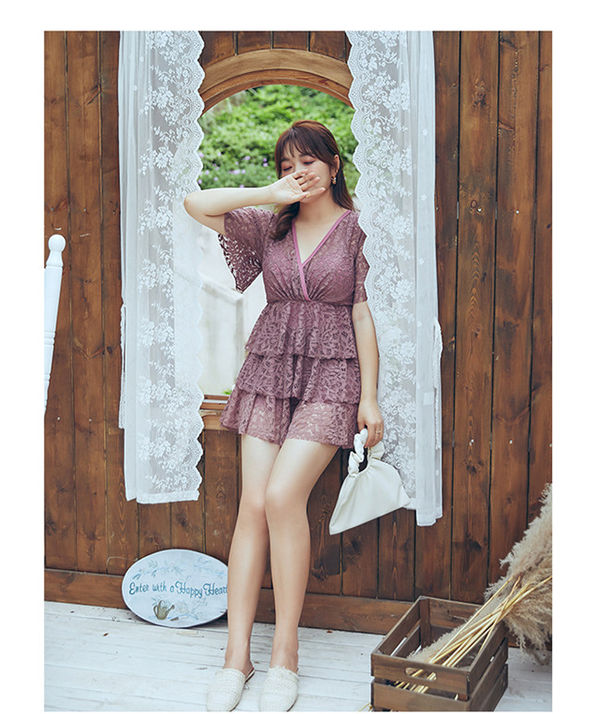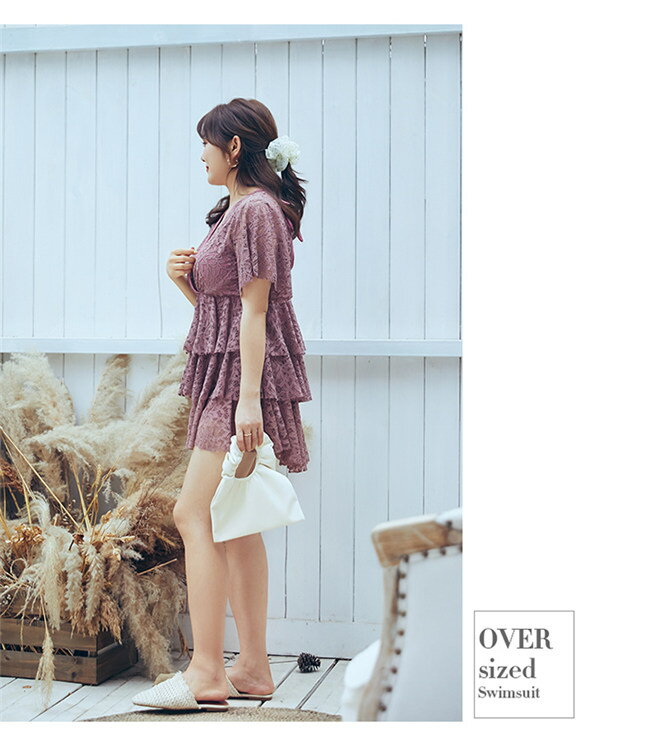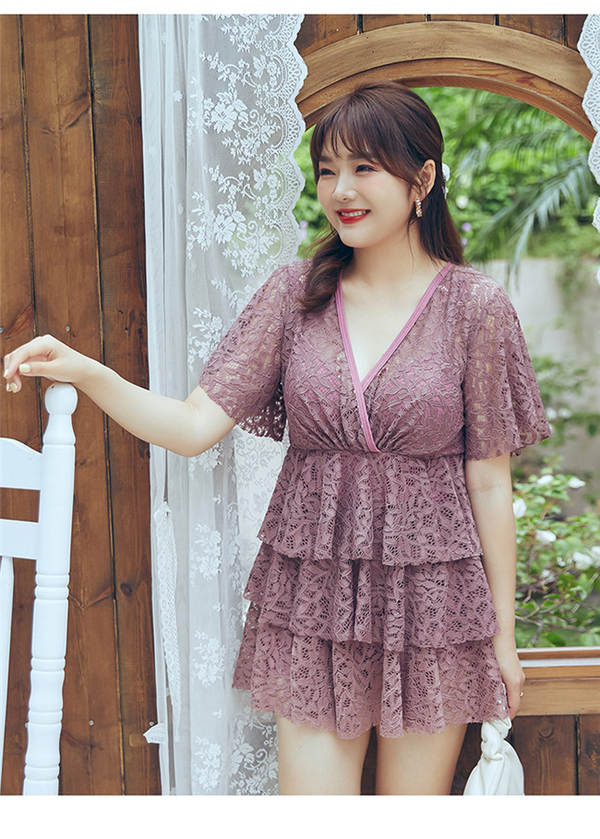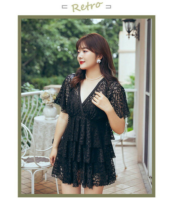 水着 大きいサイズ ぽっちゃり レディース ぽっちゃり水着 袖あり 体型カバー 韓国 可愛い 無地 カシュクール エンジェルスリーブ 3段フリル 二の腕カバー ママ水着 フリル ガーリー カジュアル フェミニン 黒 紫 すみれ オトナ女子 3L 4L 5L 6L 20代 30代 40代 df531c0c0g5