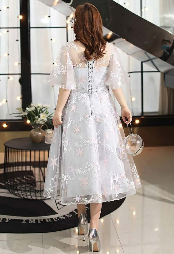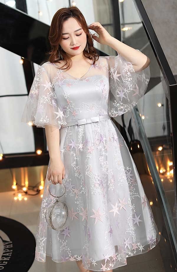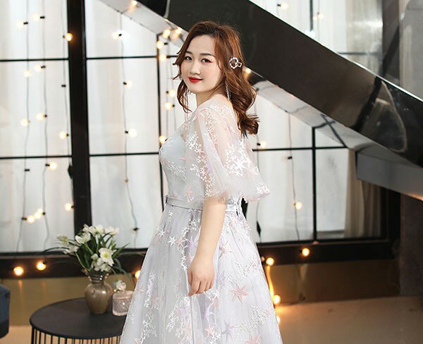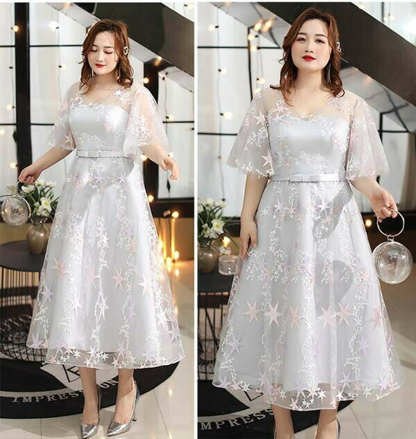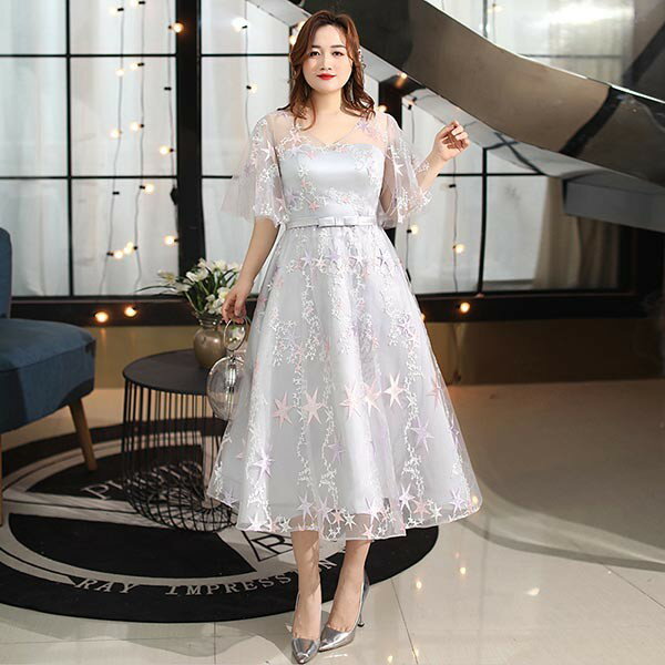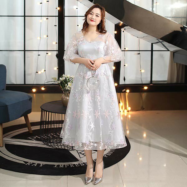 ドレス 大人 ピアノ 発表会 演奏会用ドレス 演奏会 イブニングドレス 結婚式 母親 ピアノ発表会 中学生 パーティードレス 発表会ドレス ミモレ丈ドレス 袖付き 高校生 大きいサイズ コンクール ミモレ丈 五分袖 透明感 Vネック ぽっちゃり 5L 6L 7L グレー dp097t2t2g5