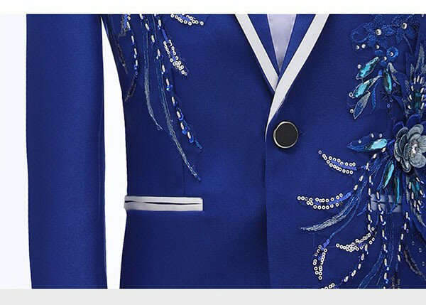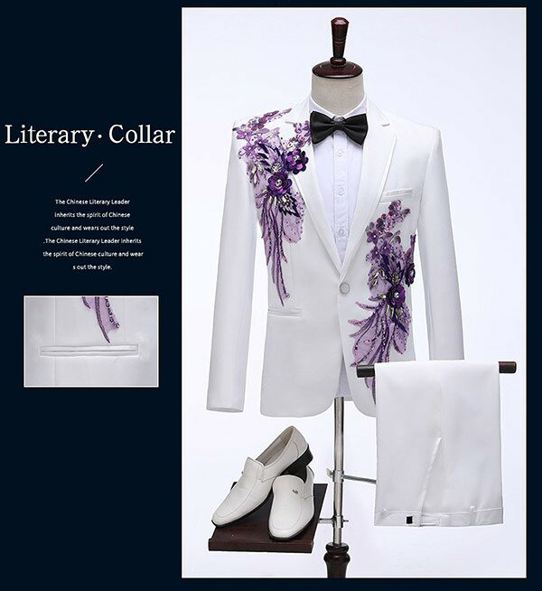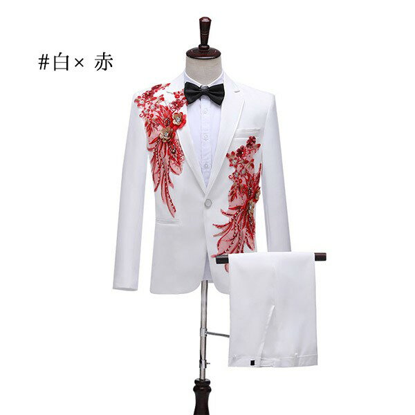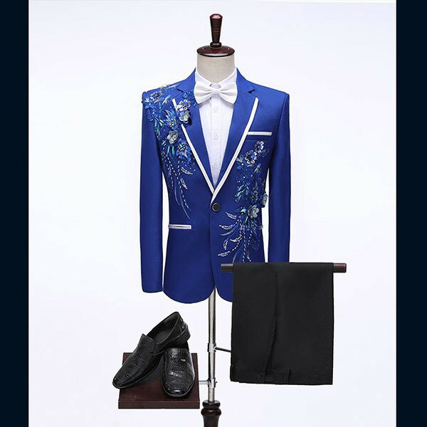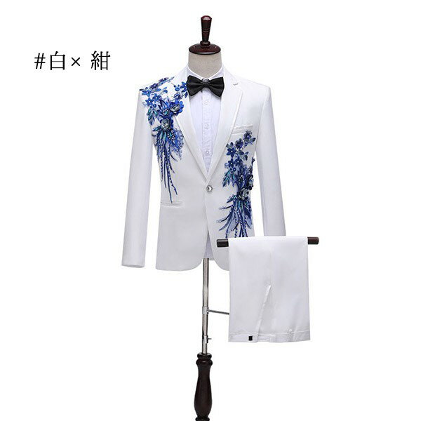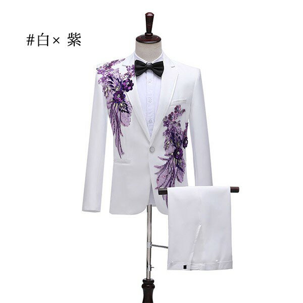 タキシード 光沢のあるジャケット メンズ スーツ ジャケット 長ズボン 上下セット 2点セットアップ 演出服 ステージ衣装 スパンコール 衣装 黒白 2色選べるズボン 白 紺 紫 赤 青 スパンコール きらきら クリスマス仮装 ハロウィン衣装 dg140x1x1x0