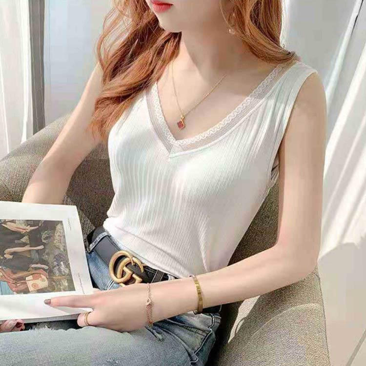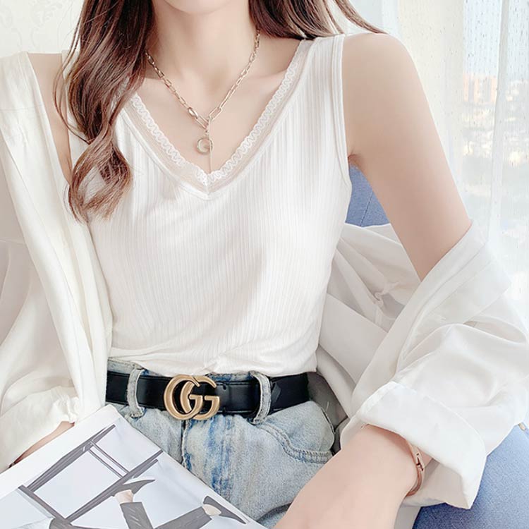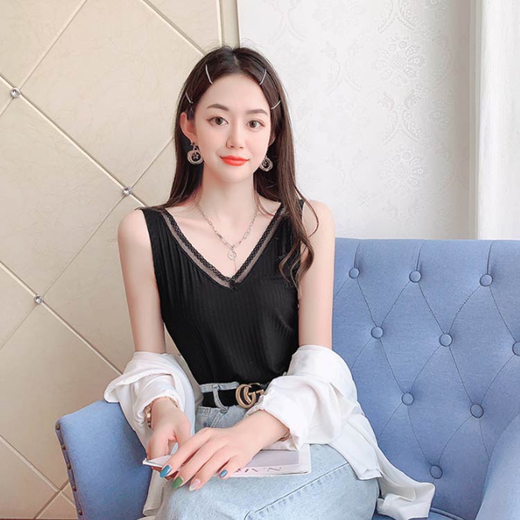 ノースリーブ カットソー レース付き レディース タンクトップ Vネック インナー 送料無料 Tシャツ 送料無料 カジュアル フライス 無地 レギュラー スリム 綿 おしゃれ きれいめ