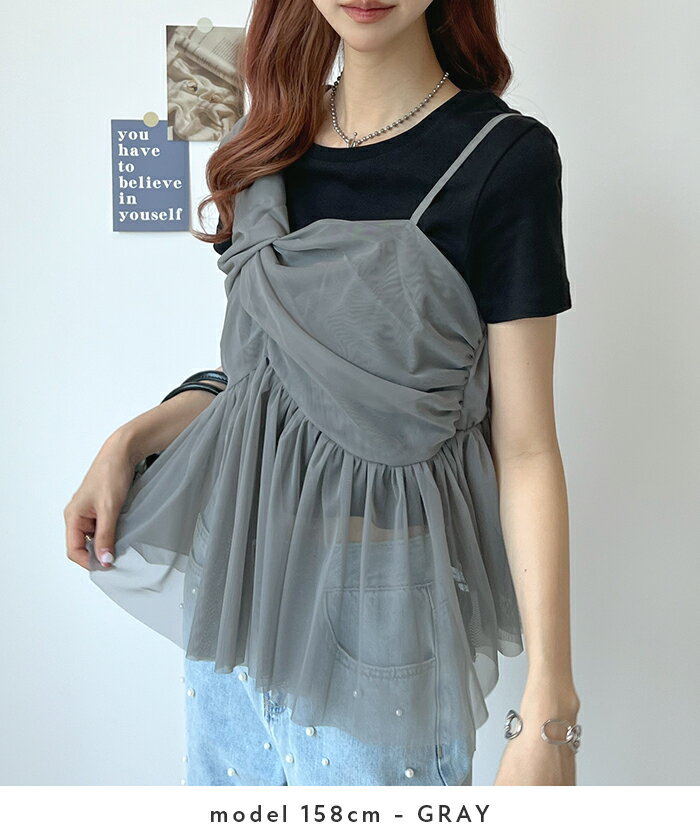 全品10%OFFクーポン★ キャミソール チュール シアー 透け感 オーガンジー トップス ノースリーブ レディース 夏 カジュアル シンプル 大人可愛い 韓国ファッション YP/ チュールアシンメトリーデザインキャミソールトップス