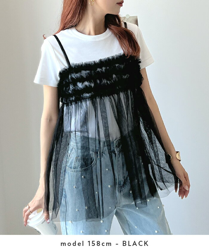 最大30%OFFクーポン★ 売切りSALE今だけ【4990円→1000円】キャミソール フリル チュール シアー 透け感 オーガンジー トップス ノースリーブ レディース 夏 カジュアル シンプル 大人可愛い 韓国ファッション YP/ フリルチュールキャミソール
