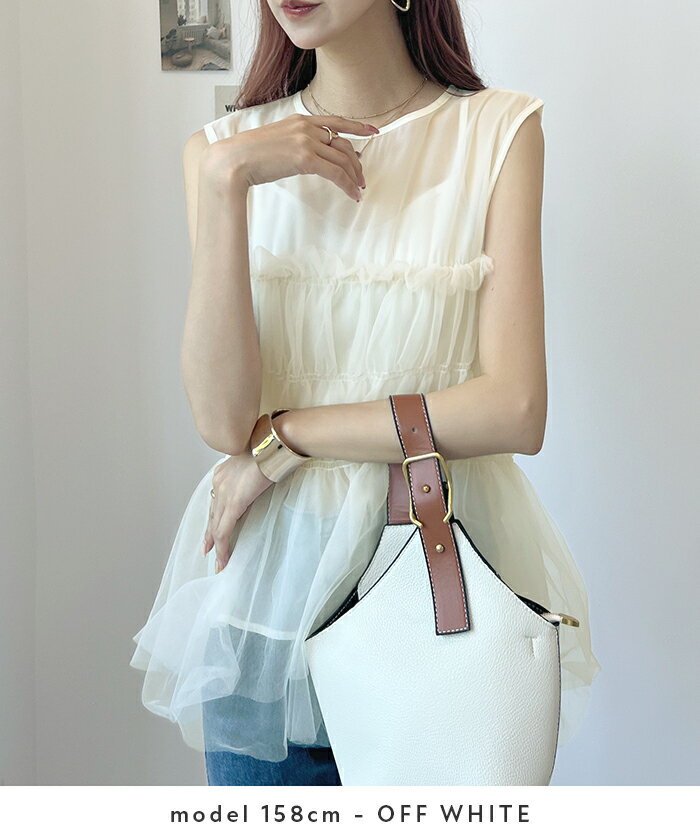 全品10%OFFクーポン★ ノースリーブ フリル チュール シアー 透け感 オーガンジー トップス キャミソール レディース 夏 カジュアル シンプル 大人可愛い 韓国ファッション YP/ オーガンジーチュールシャーリングノースリーブプルオーバー