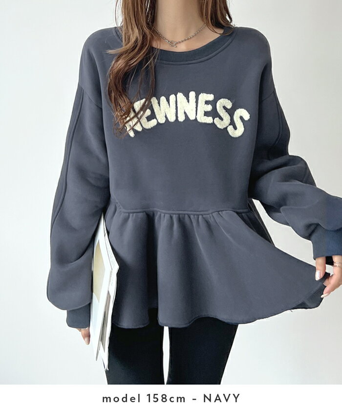 SALE価格からさらに半額クーポンで2995円★スウェット ロゴ 裏起毛 フリル ペプラム 体型カバー 暖かい 刺繍 ロゴ刺繍 華奢見え 細見え レディース カジュアル 韓国ファッション / NEWNESSロゴフリルスウェット