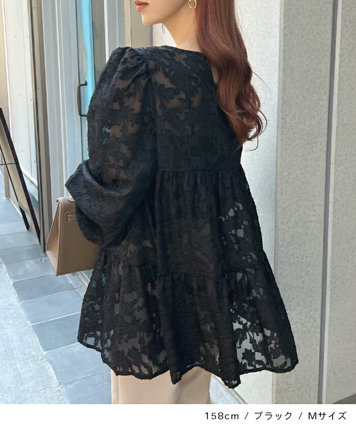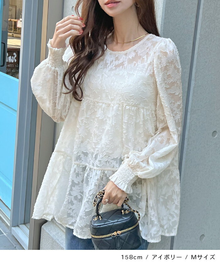半額クーポンで2495円★☆チュニック ブラウス 長袖 シアー 透け感 オーガンジー トップス キ ペプラム 花柄 ワンピース ティアード レディース カジュアル シンプル 大人可愛い 韓国ファッション YP/ ジャガードフラワーシアーチュニック