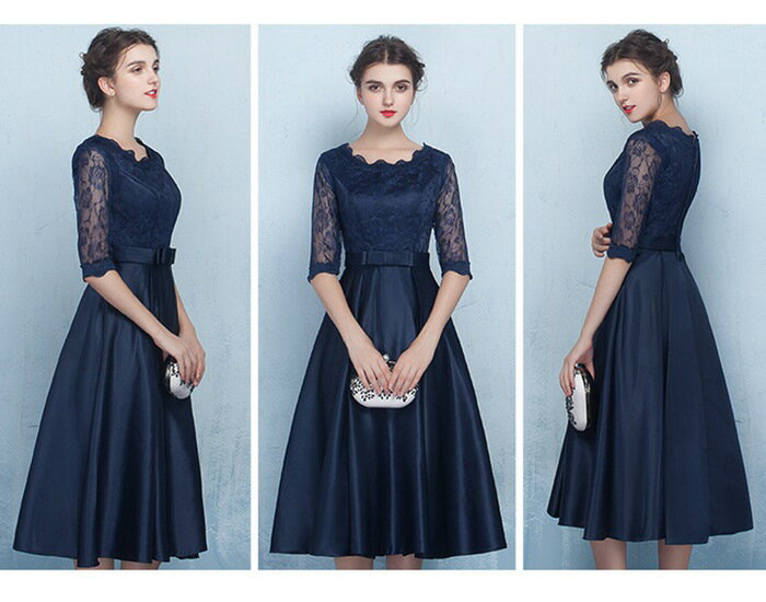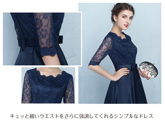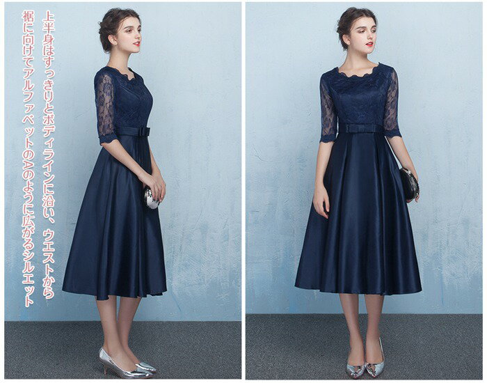 【赤字覚悟★50%OFF!】パーティードレス ミモレ丈 二次会 結婚式 ドレス 半袖 ウェディングドレス 花嫁 パーティドレス お呼ばれ 披露宴 お呼ばれ 演奏会 卒業式 ネイビー