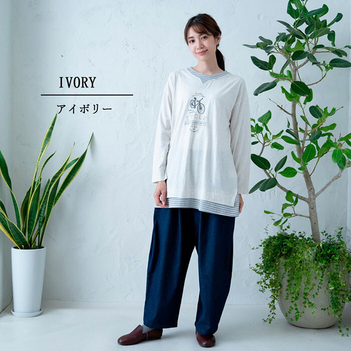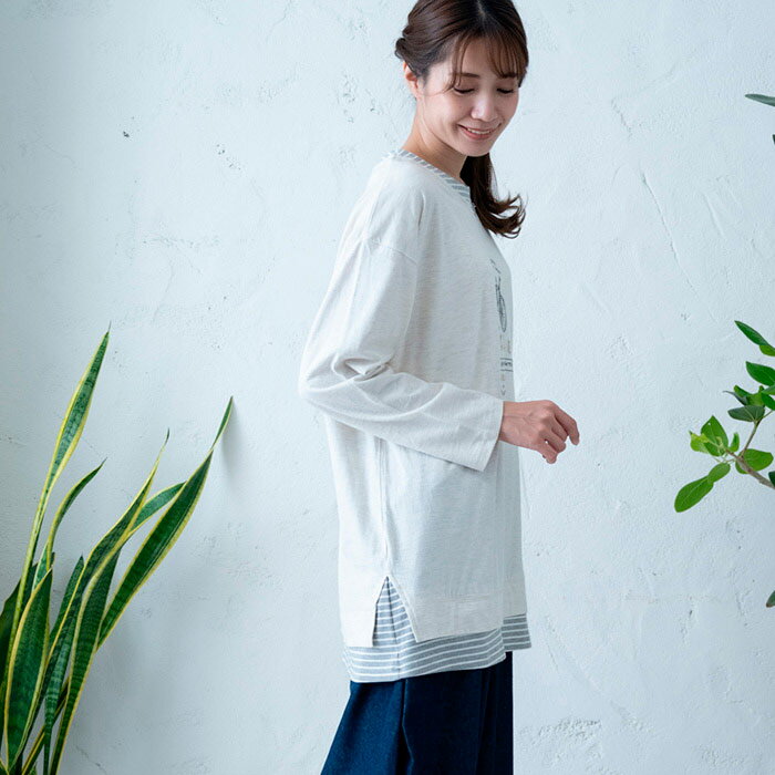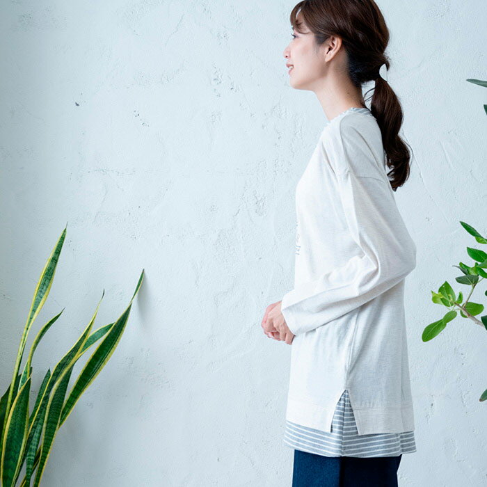 【レイヤード風チュニック】レディース/トップス/長袖/大人の/ナチュラル/カジュアル/イマゴ/重ね着風/自転車/刺繍/切りっぱなし