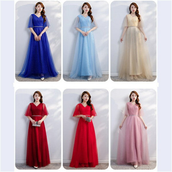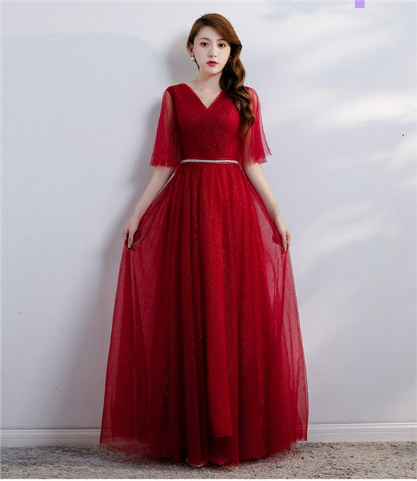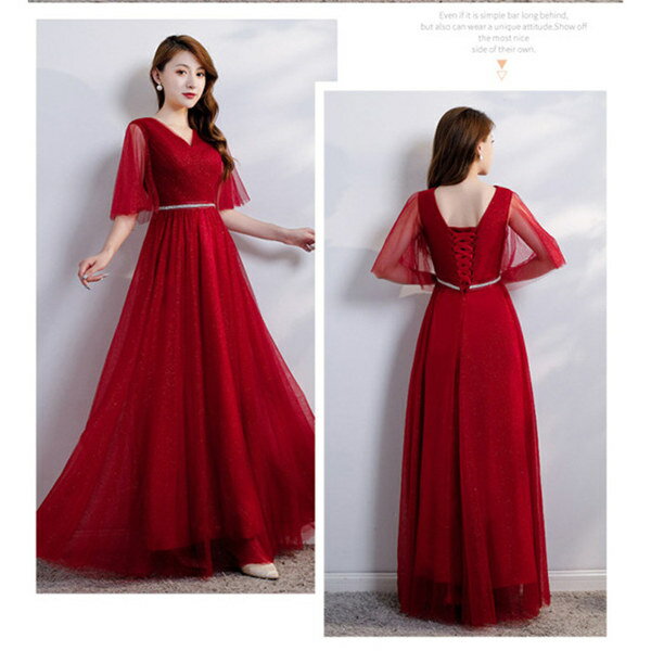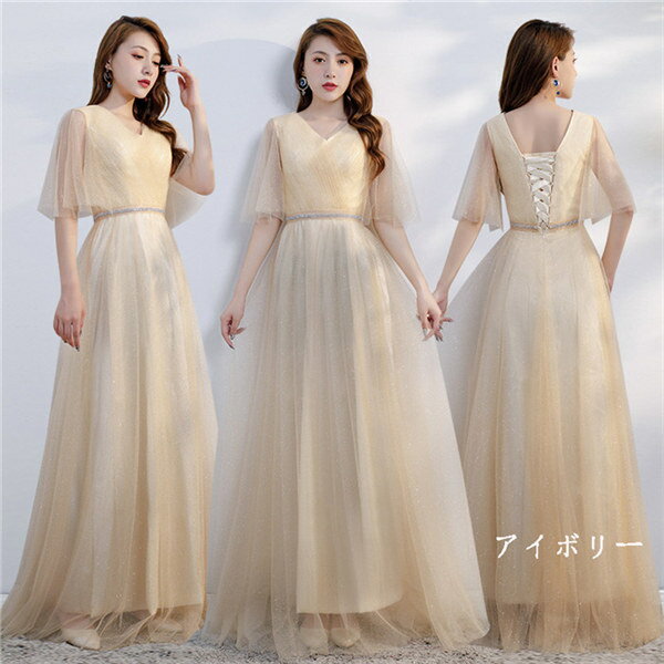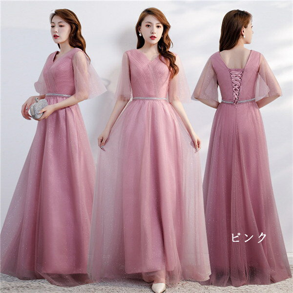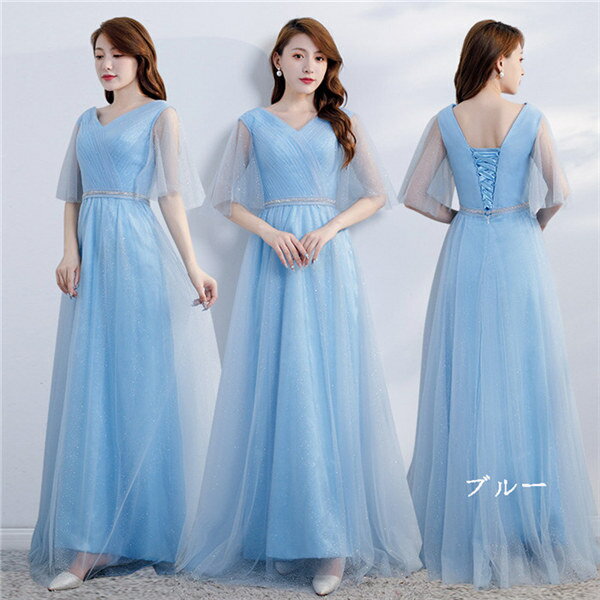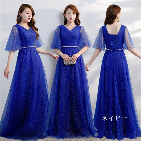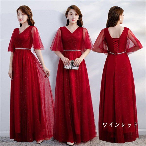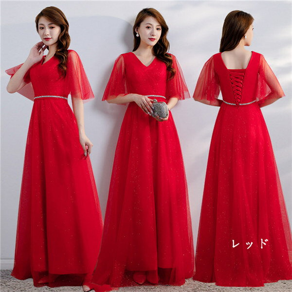 ★500円OFFクーポン配布中★パーティードレス 披露宴 イブニングドレス ロング 演奏会 発表会 Aライン Vネックドレス 二次会 ステージ 衣装 30代 40代 50代 60代 レッド ワインレッド ネイビー ピンク ブルー アイボリー S/M/L/XL/2XL/3XL