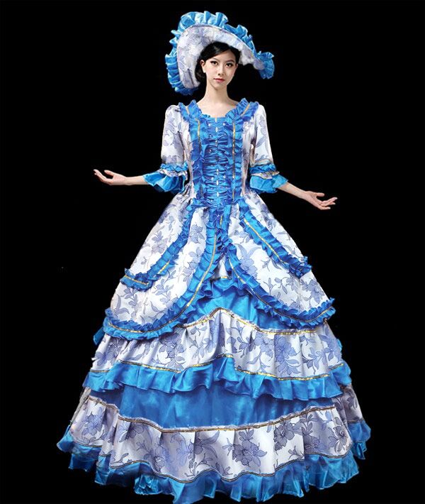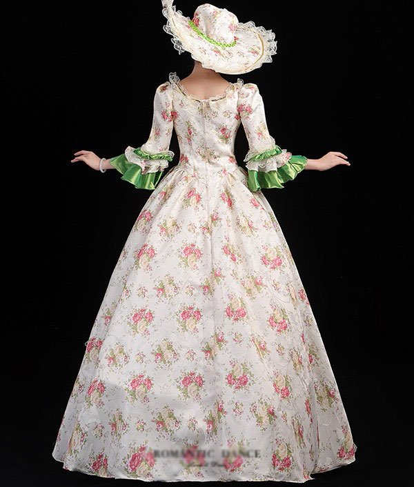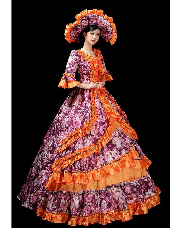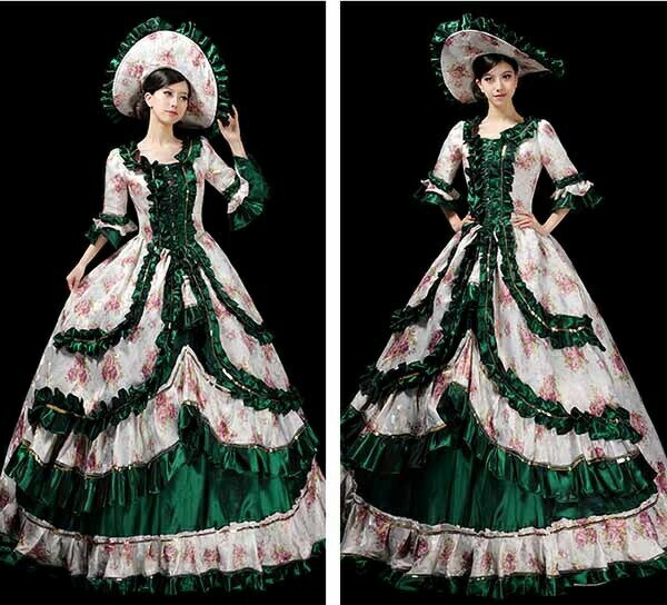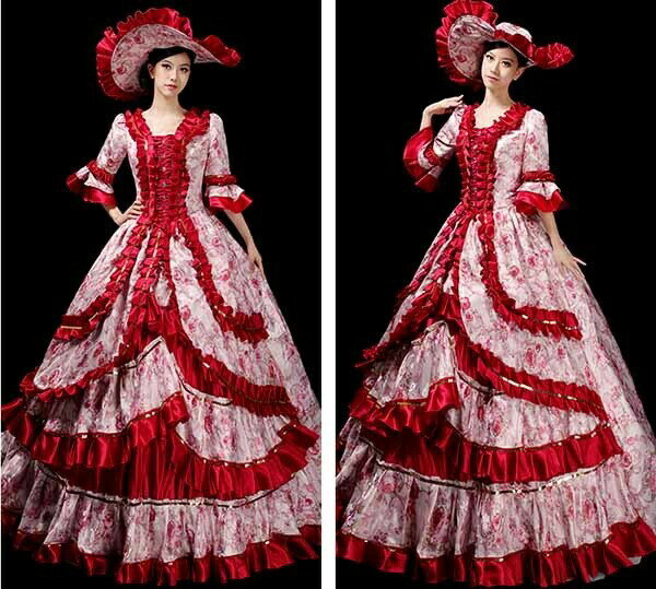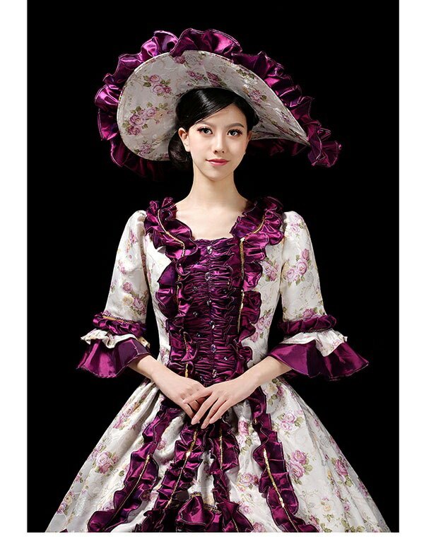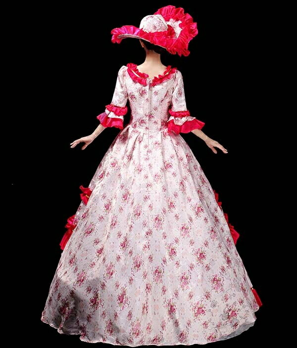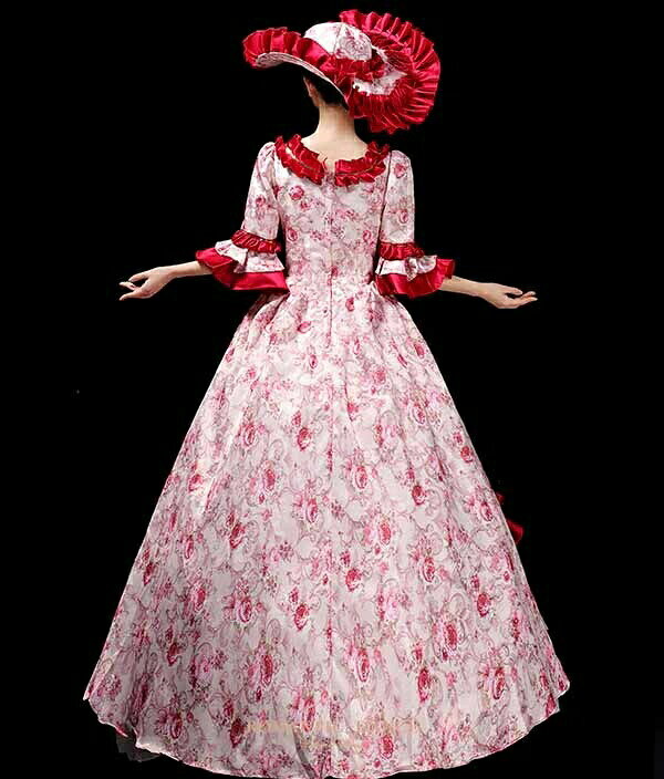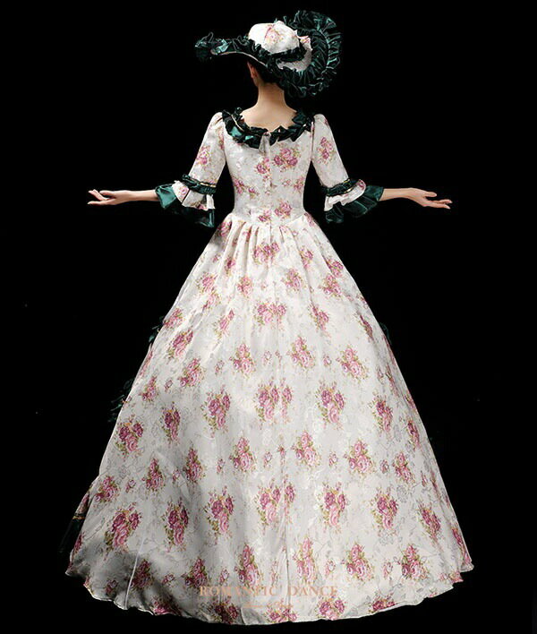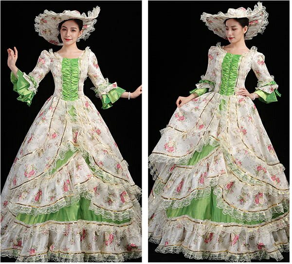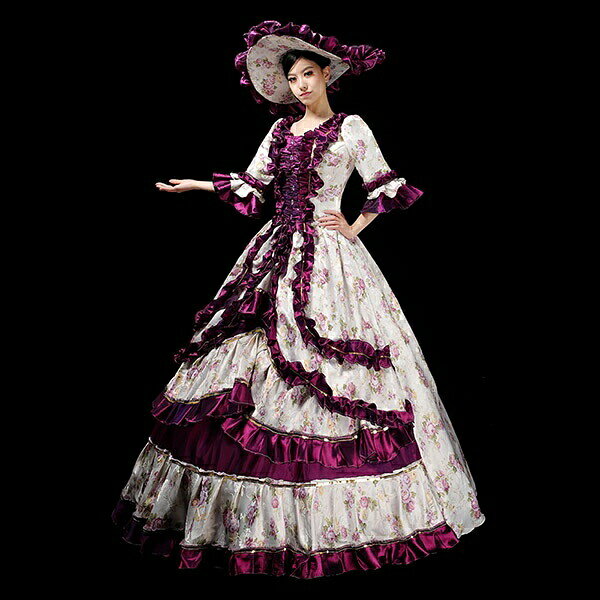 ロングドレス 貴族ドレス お姫様ドレス 中世ヨーロッパ ステージ 袖あり アンブレラスリーブ 貴婦人 帽子付き 演奏会 舞台衣装 花柄 貴族風 イベント衣装 声楽 オペラ プリンセスライン ワンピース 撮影 コスプレ Aライン ピンク パープル グリーン S M L XL