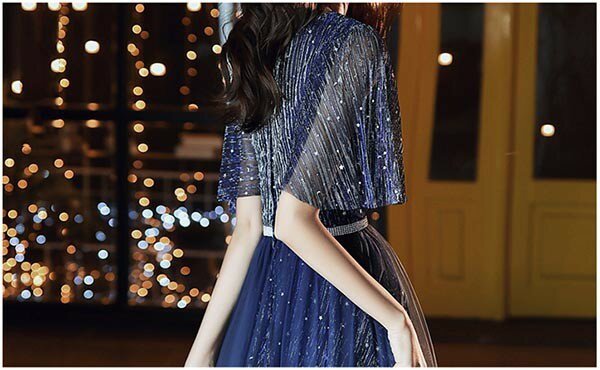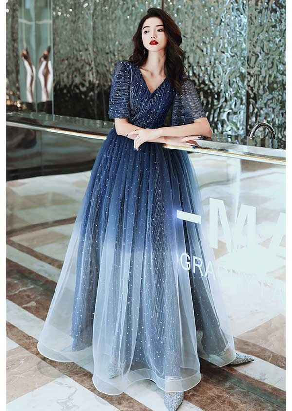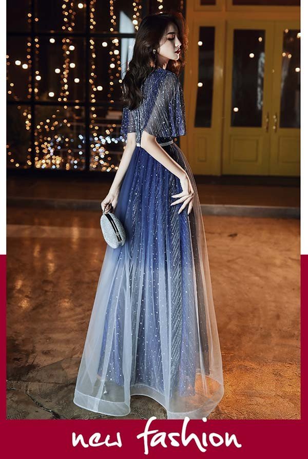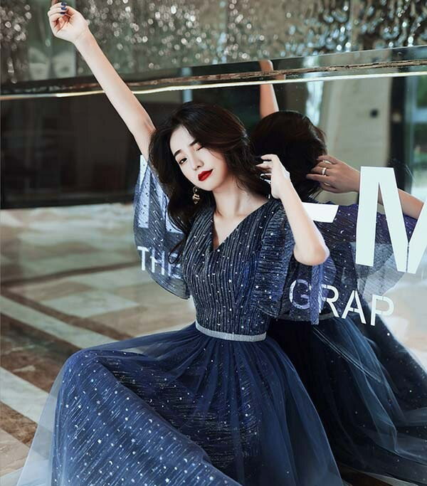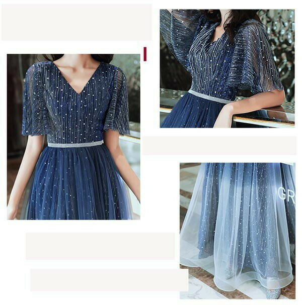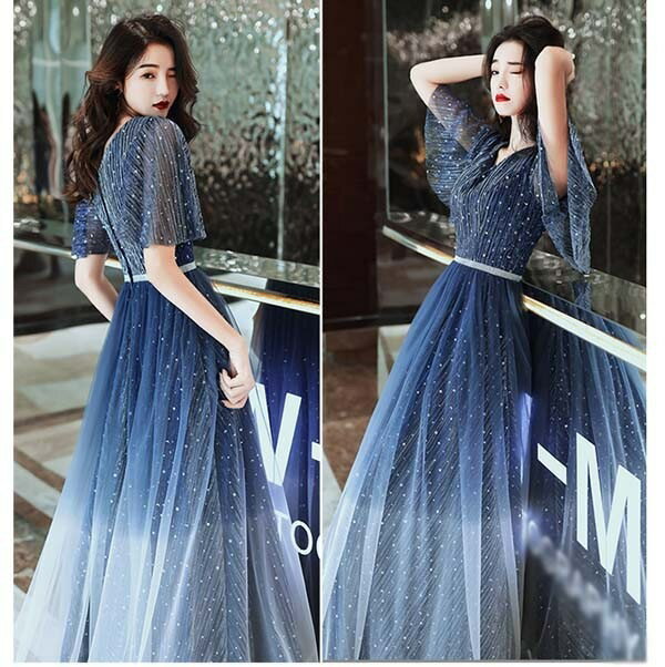 ★500円OFFクーポン配布中★ロングドレス 演奏会用ドレス 袖付き Vネック キラキラドレス ピアノ発表会 ドレス 大人 パーティードレス お呼ばれ 他と被らない フォーマル ワンピース 結婚式 大きいサイズ XS S M L XL 2XL 青