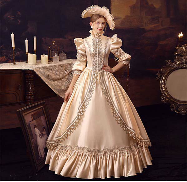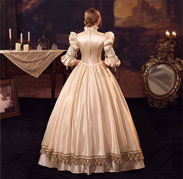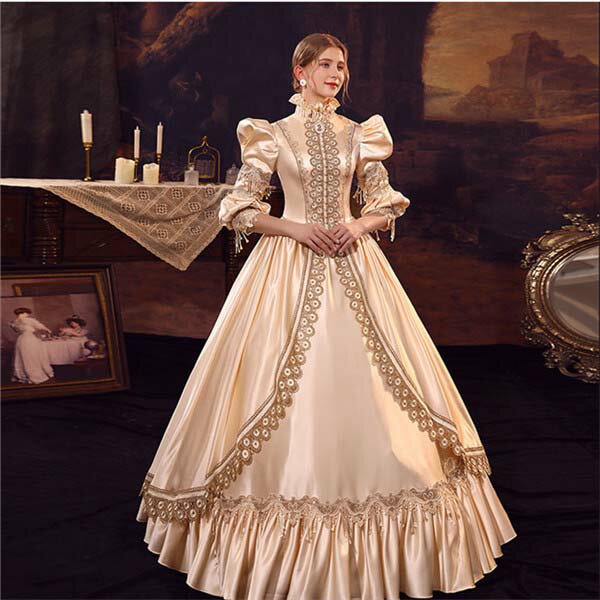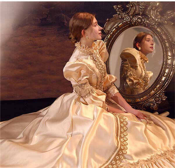 華麗な 宮廷ドレス ドレス レディース ロングドレス シャンパン ロココ 貴族ドレス 18世紀 ハイネック 中世ヨーロッパ お姫様 プリンセスドレス サイズ指定OK 西洋ドレス ステージ衣装 貴婦人 オペラ ワンピース