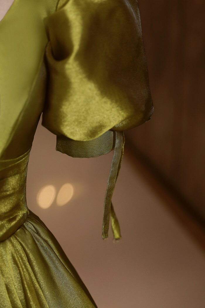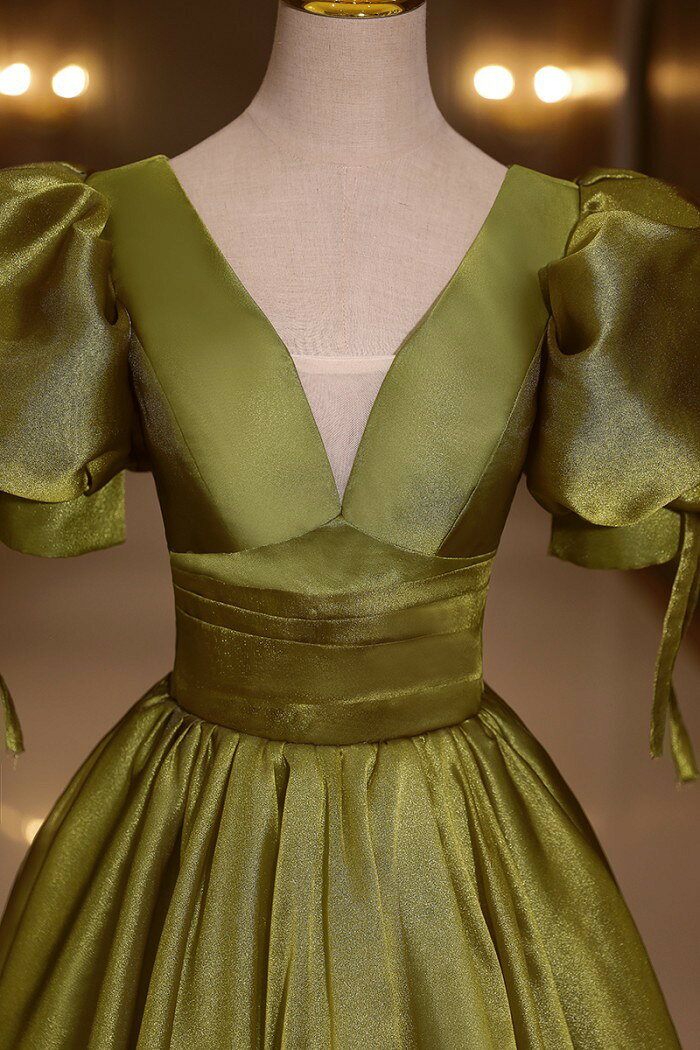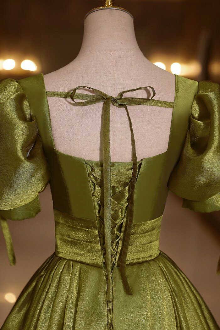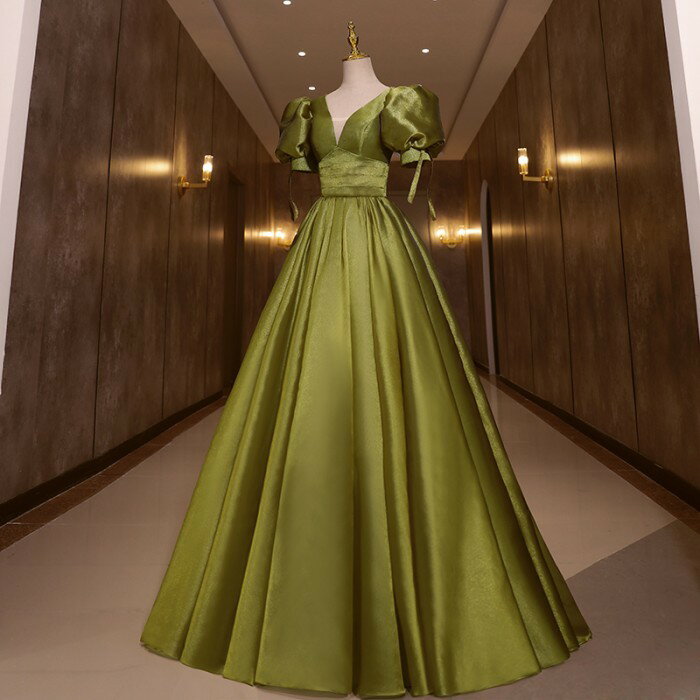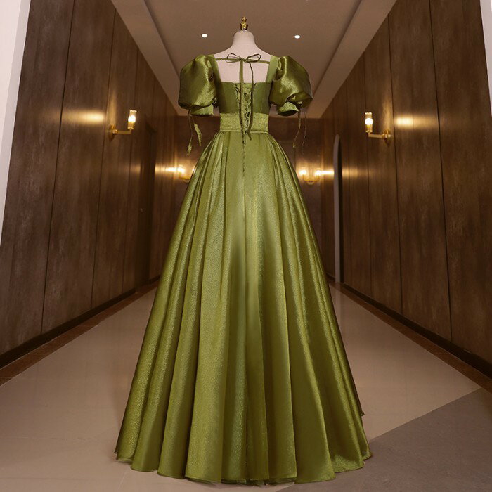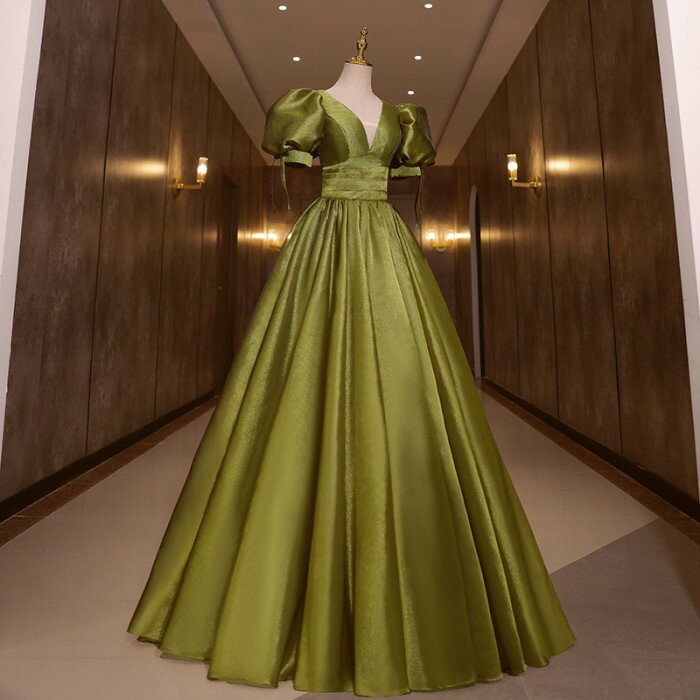 ★500円OFFクーポン配布中★カラードレス お色直し グリーン 緑 結婚式 ロングドレス 演奏会 袖あり ポワント袖付き パフスリーブ パーティードレス フォト婚 ピアノ発表会 イブニングドレス バックレスドレス 編み上げ プリンセスライン 透け感 イベント 演出 舞台