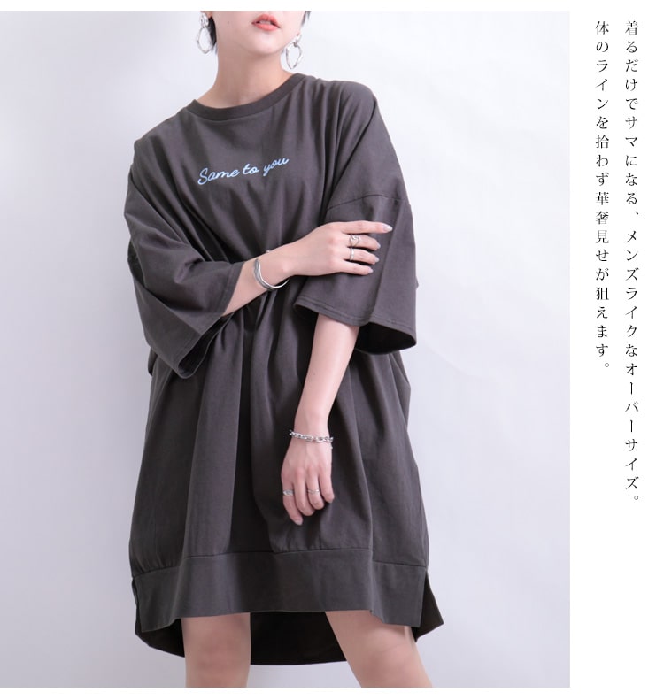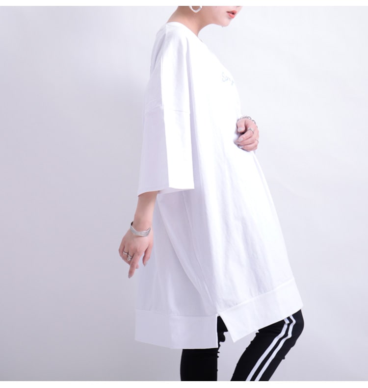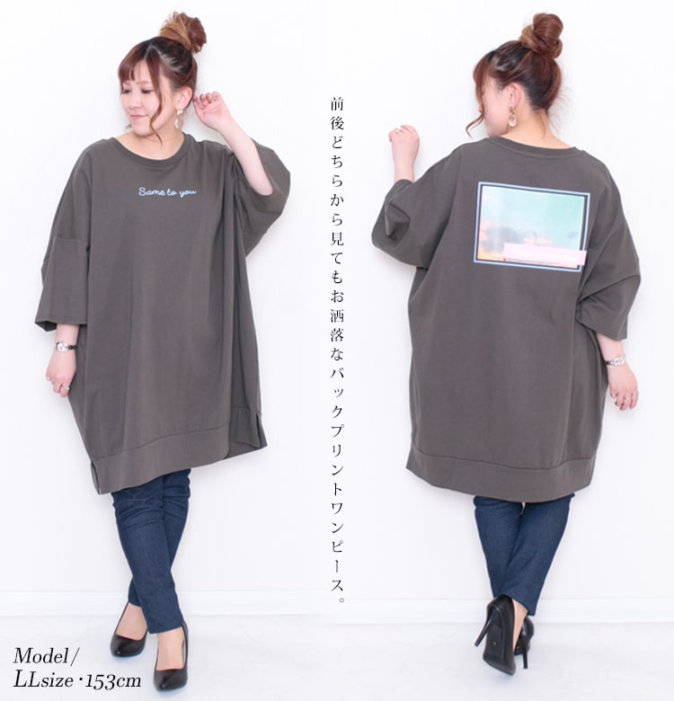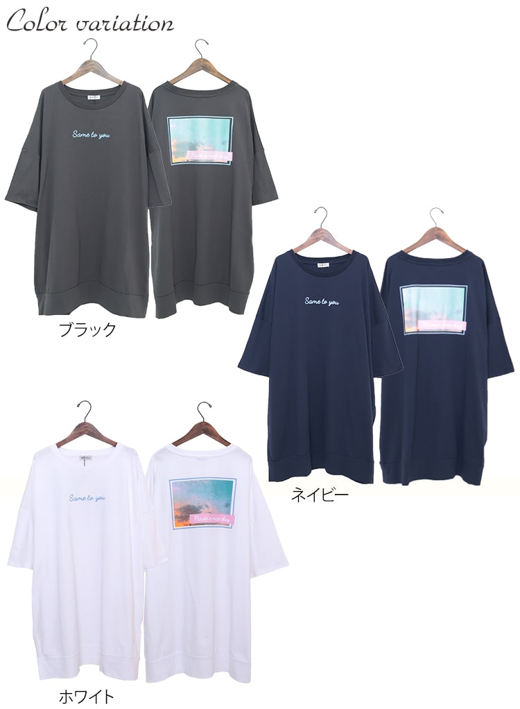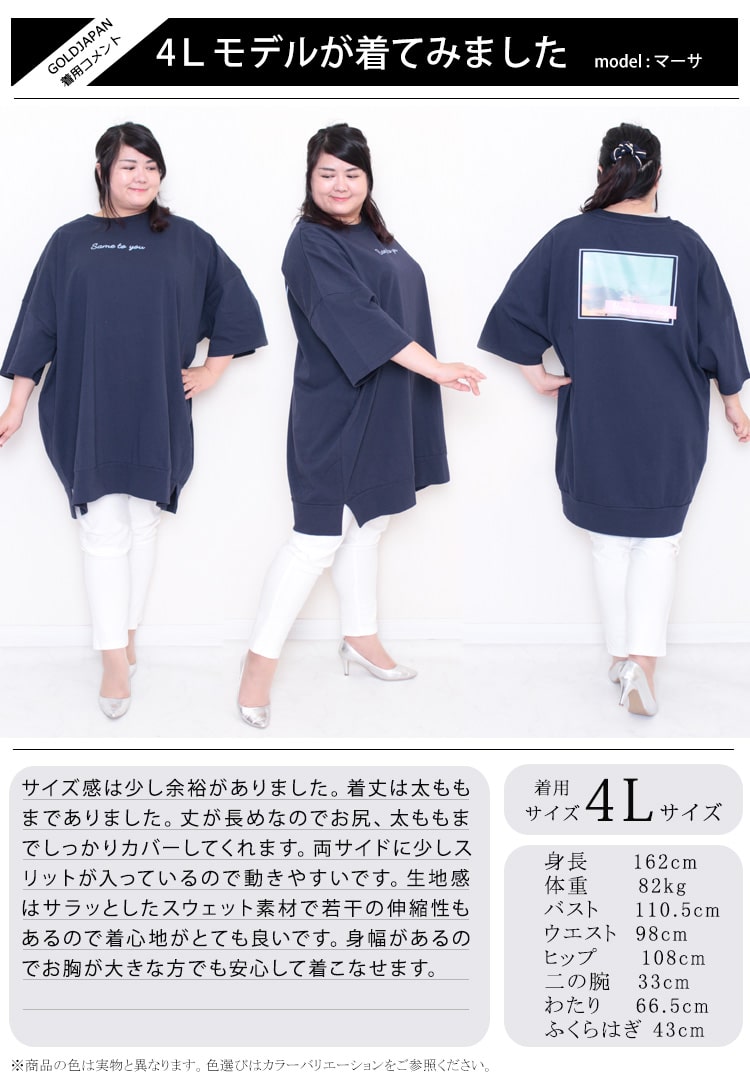 大きいサイズ レディース トップス Tシャツ カットソー バックプリントビッグTシャツチュニックワンピース ビックTシャツ バックプリント 五分袖 半袖 ロング プリント スリット ルーム 無地 夏新作 春服 夏服 3L 4L 5L ホワイト 白 ブラック 黒 ネイビー ゴールドジャパン