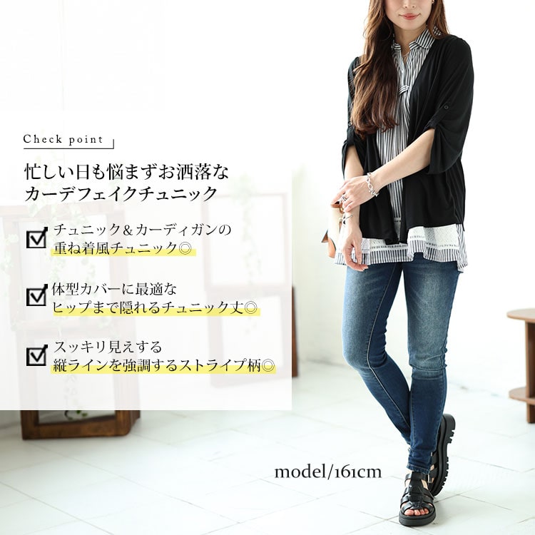 大きいサイズ レディース トップス カットソー フェイクレイヤード裾レースストライププルオーバー フェイクレイヤード 7分袖 シャツ ストライプ柄 レース タック フェイクカーデ ストレッチ 春新作 春服 夏服 秋服 LL 2L 3L 4L 5L ネイビー ブラック 黒 ゴールドジャパン