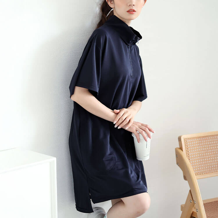 大きいサイズ レディース チュニック ハーフZIPミニハイネックチュニック 半袖 5分袖 スポーツウェア スポーツ テニスウェア ゴルフウェア ゴルフ ジップ ポケット ロング ストレッチ 無地 春新作 春服 夏服 秋服 冬 LL 2L 3L 4L 5L ネイビー ホワイト 白 ゴールドジャパン