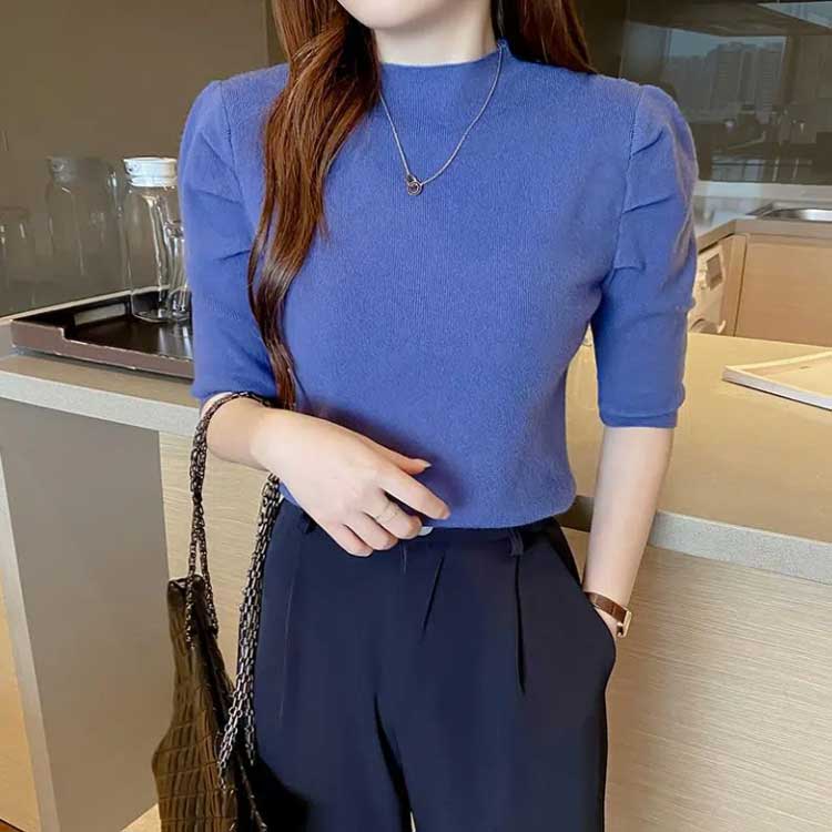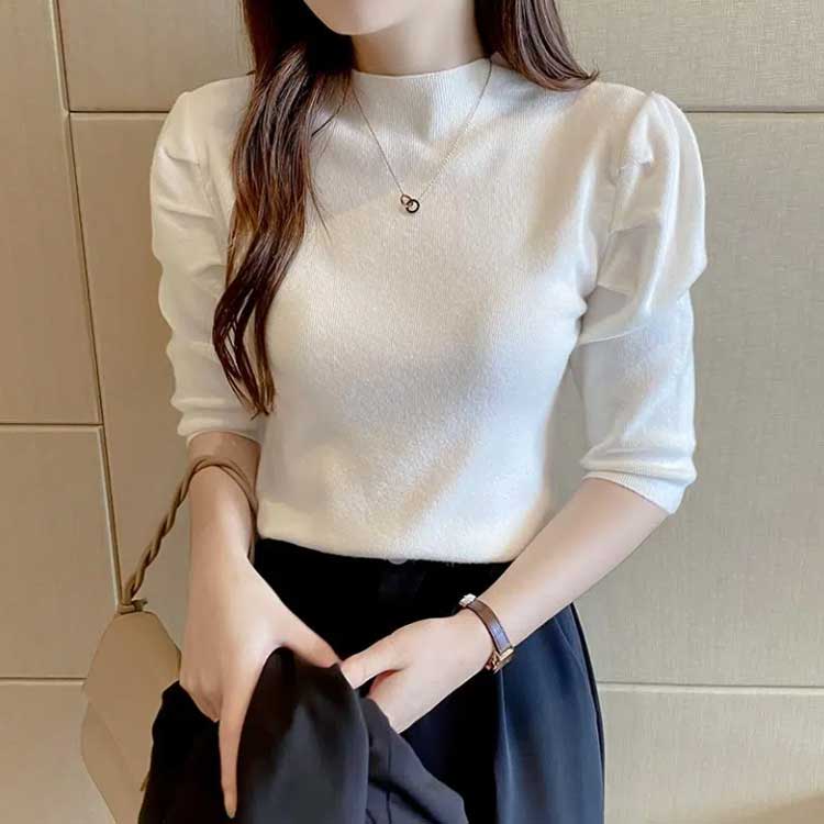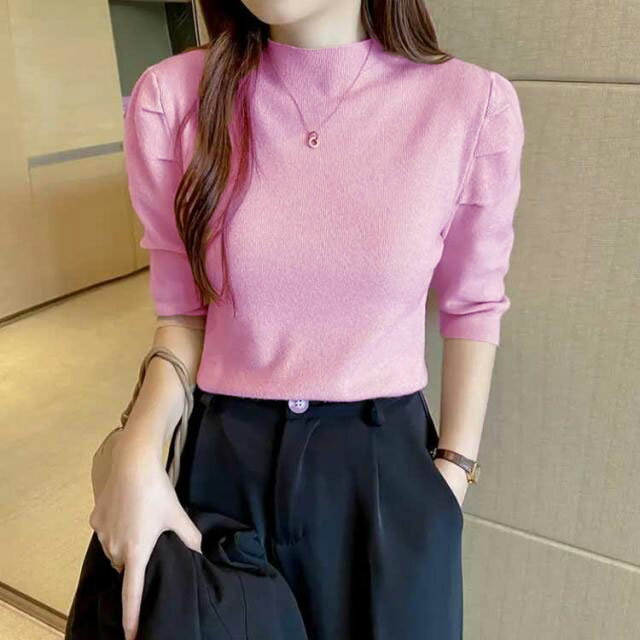 30代 パワーショルダー ハイネック レディース セーター パワショル ニット ニット 七分袖 カットソー 送料無料 ボリュームスリーブ プチハイネック ギャザーショルダー きれいめ カジュアル オフィス 20代 パフスリーブ