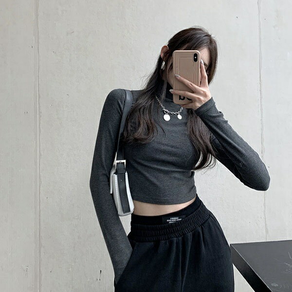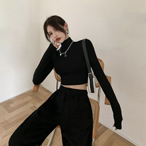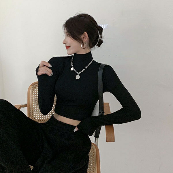 セクシー トップス ショート 丈 トップス へそ出し 短丈 ハイネック 長袖 レディース 黒 白 灰色 おしゃれ ショート 肌見せ 春 秋 冬 春物 秋物 カジュアル ハイウエスト dd248n1n1zo