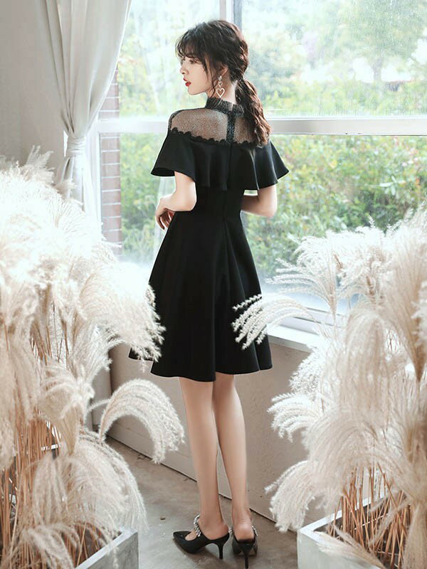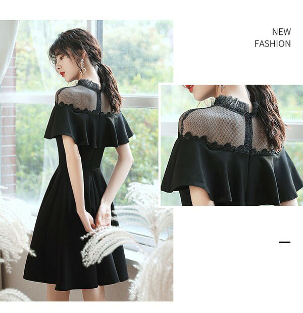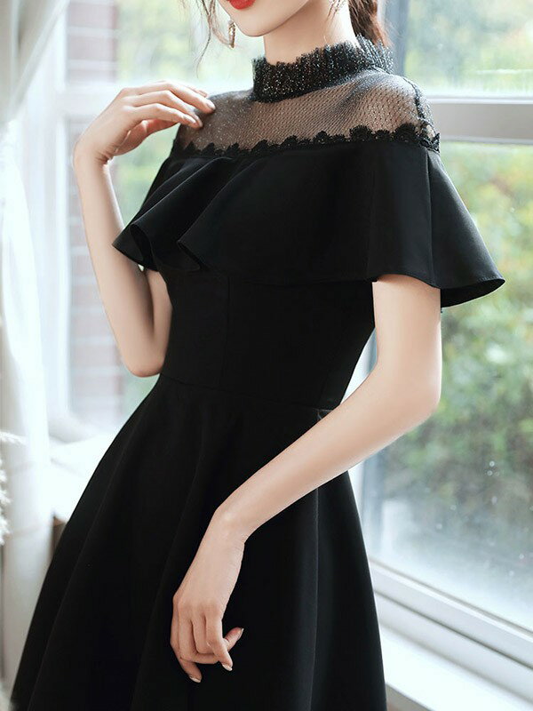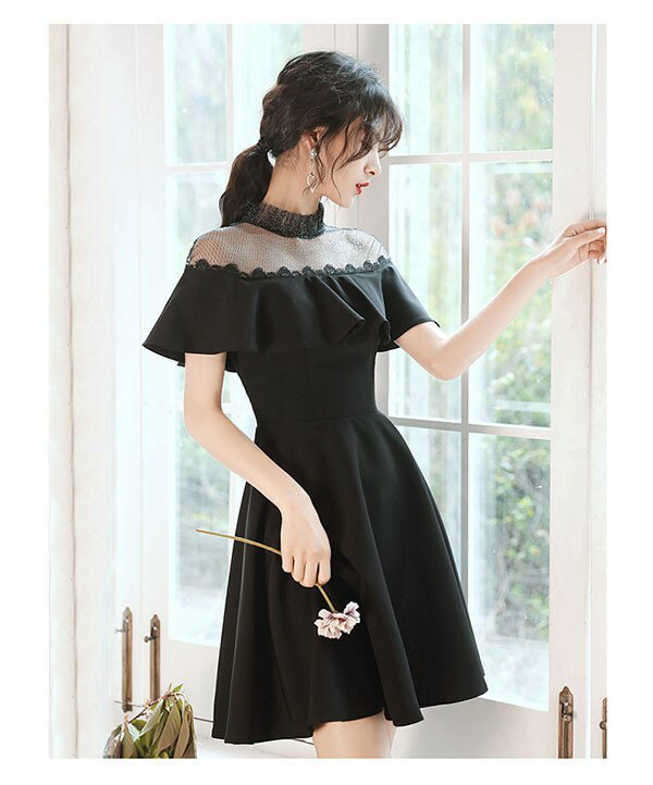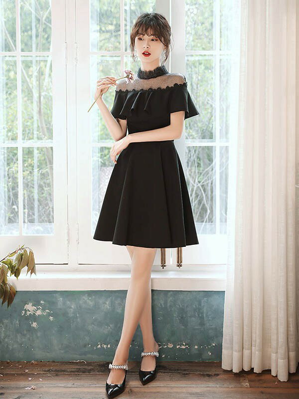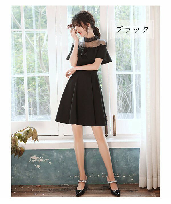 ショートドレス カクテルドレス フレアショルダー ハイネック 透け感 シースルードレス ワンピース 夏 ひざ丈ドレス 半袖あり 袖付き ファスナー 肩見せ 夏 レディース 大人可愛い Aライン 無地 パーティードレス ブラック 黒 da195x1x1d7
