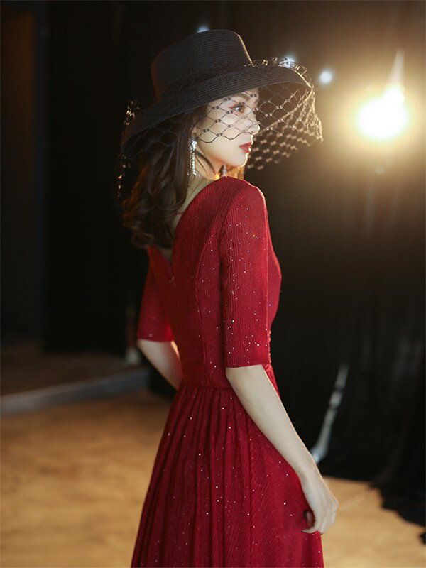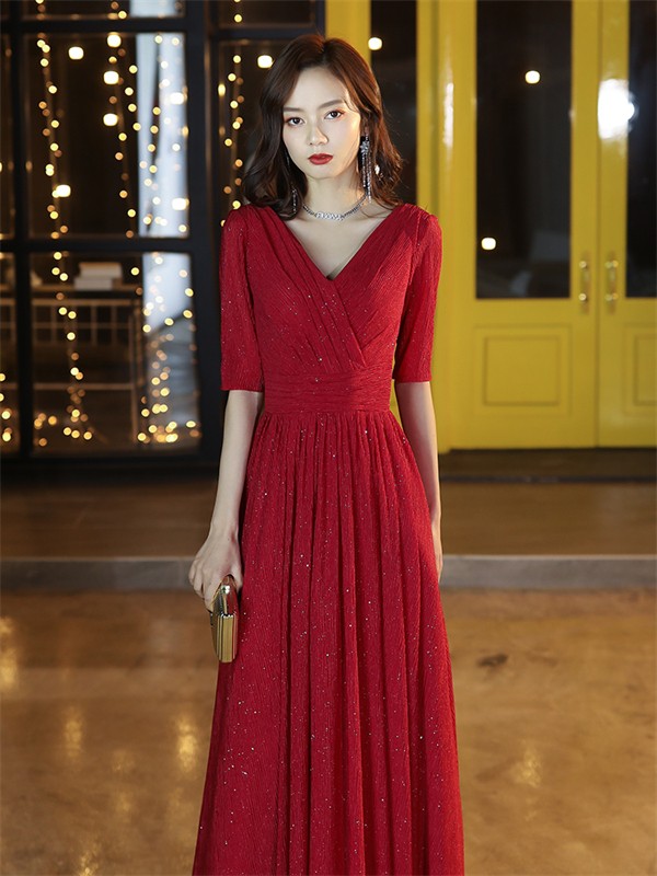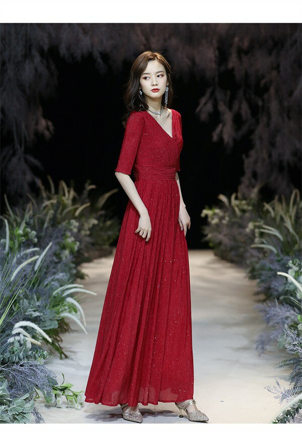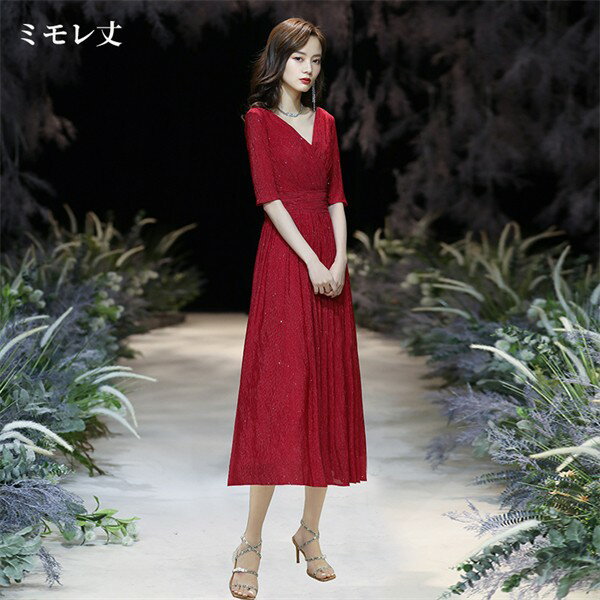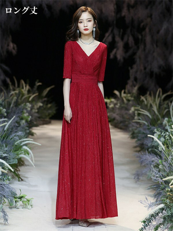 XS~6XL パーティードレス ロング ミモレ丈 演奏会 袖付き vネック ドレス ワインレッド 赤 小さいサイズ XS 大きいサイズ 4L 5L 6L 7L 五分袖 成人式 同窓会 大人 ピアノ 発表会 演奏会 Aライン 結婚式 ステージドレス 二次会 忘年会 ワンピース 上品 20代 30代 40代