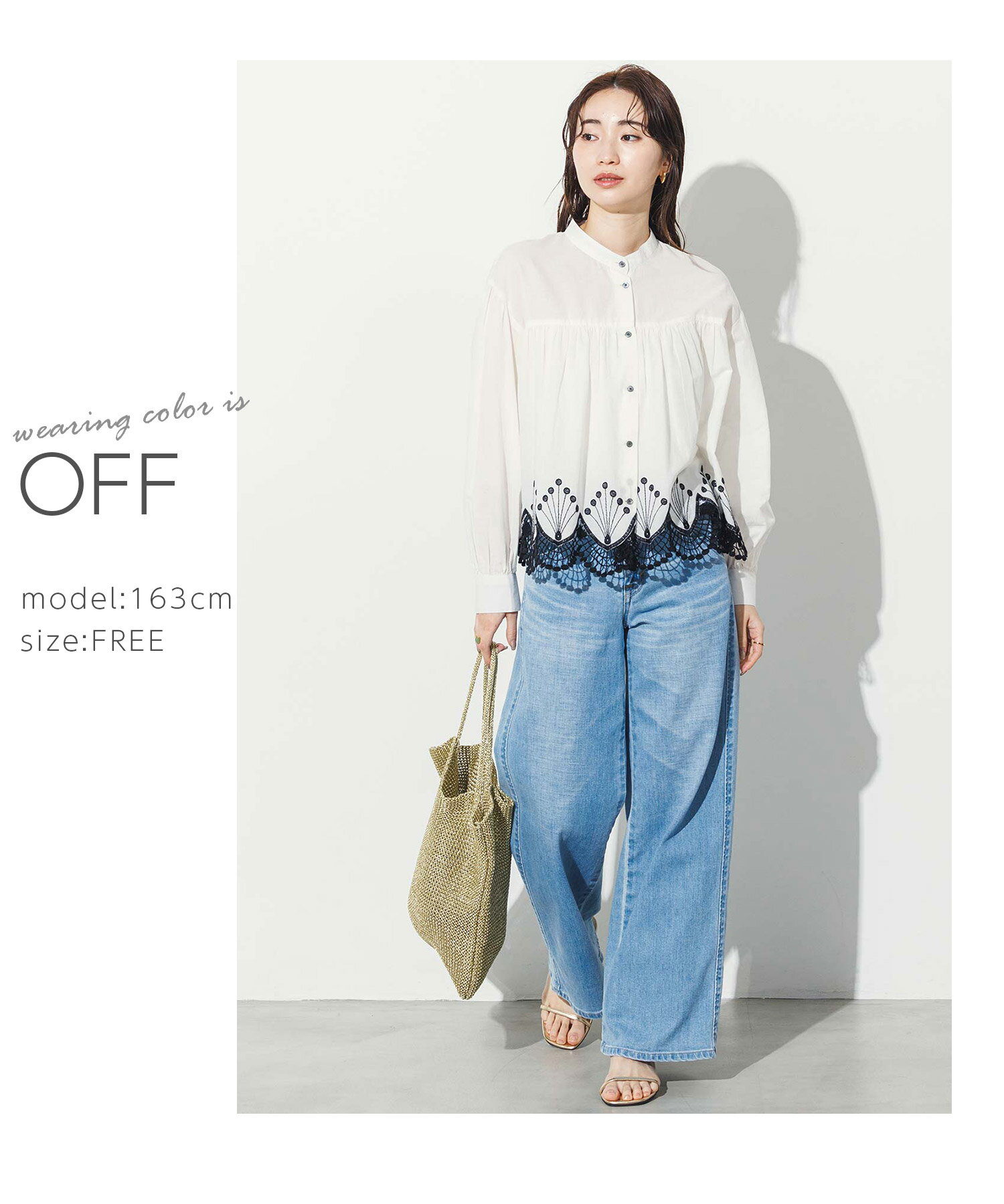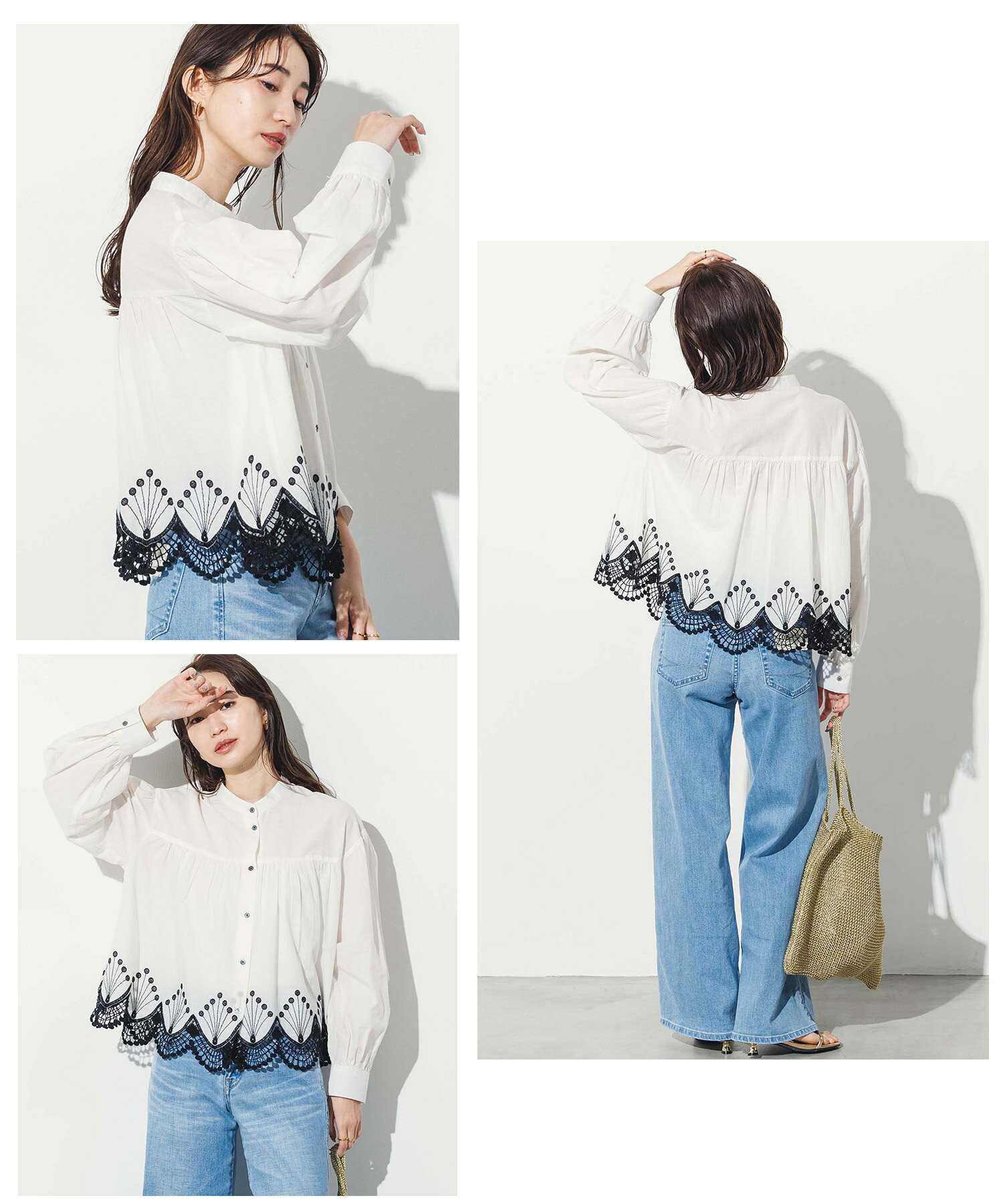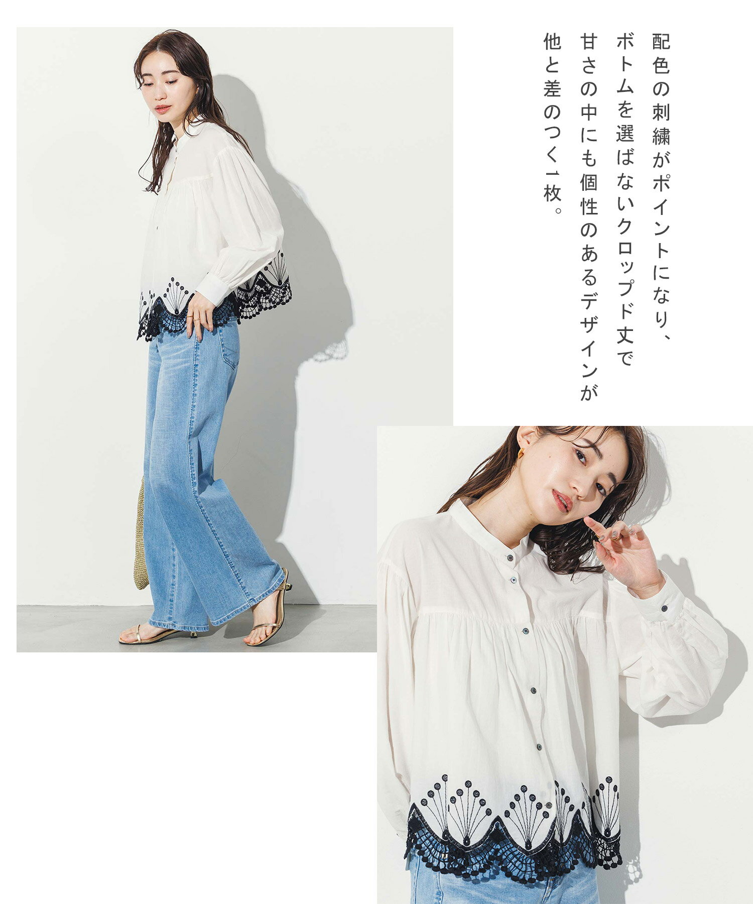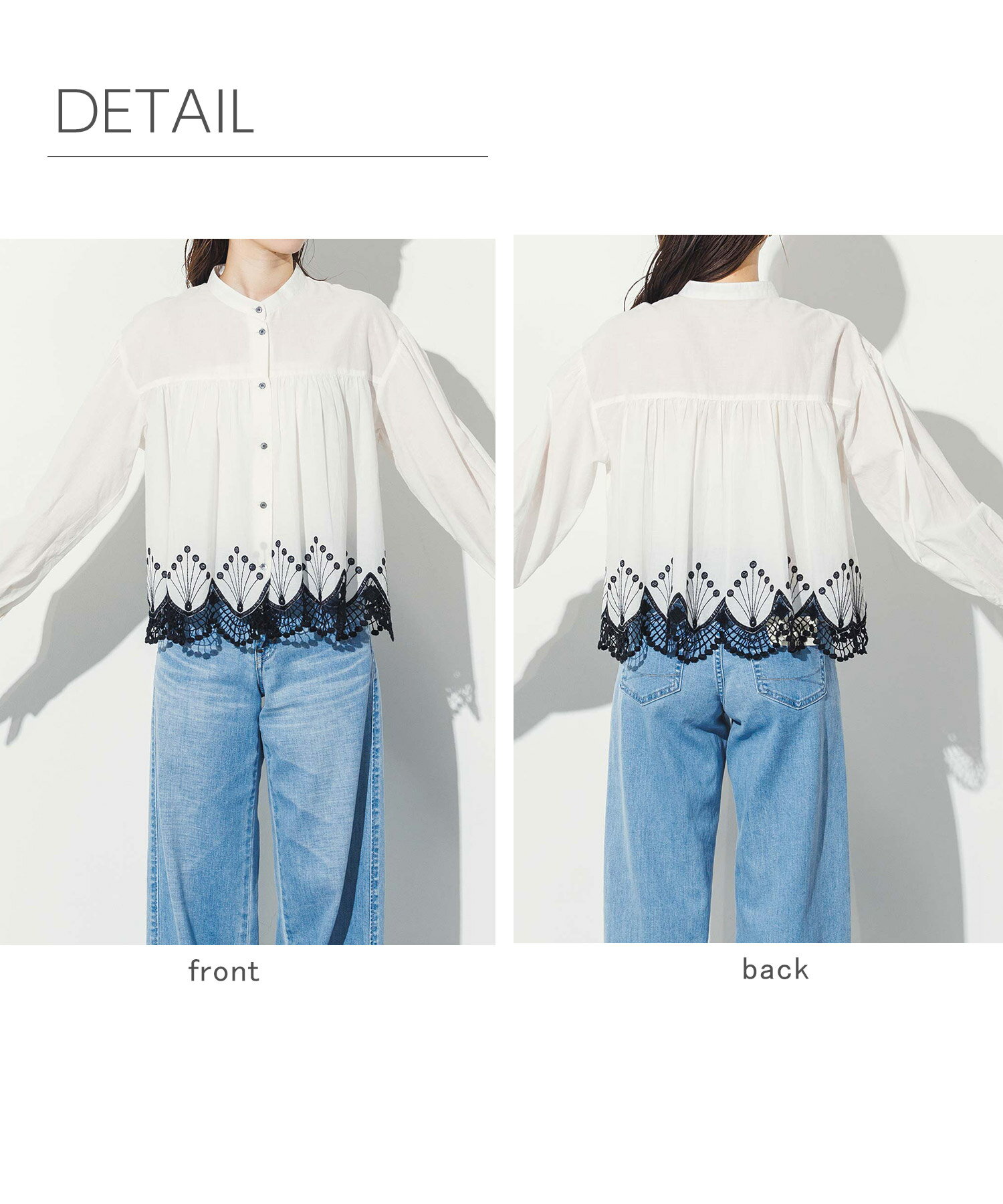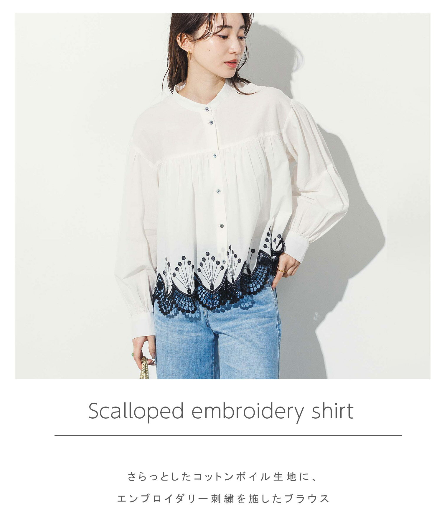 【 LINEおともだち登録でクーポン配布中! 】スカラ刺繍バンドネックシャツ