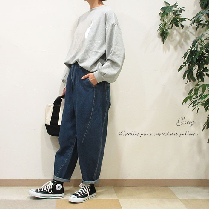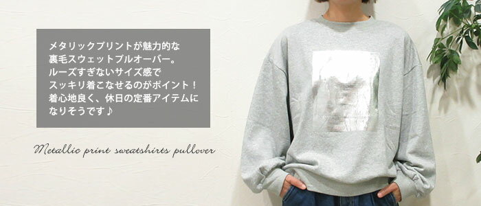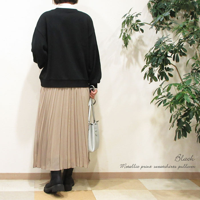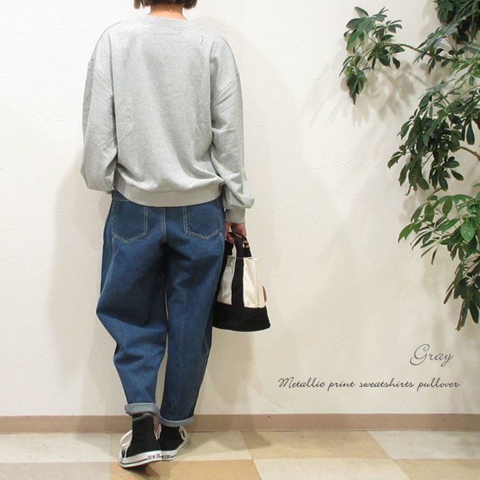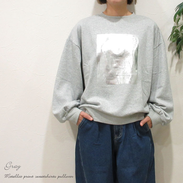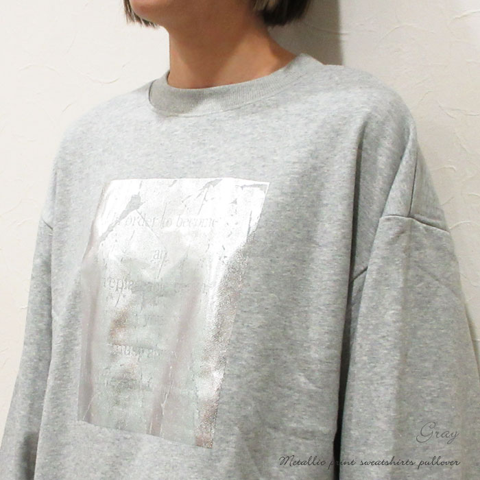クーポン利用で最大10%オフ】スウェット 箔プリント メタリックプリント 裏パイル 裏毛スウェット プルオーバー ロゴ スエット ドロップショルダー バルーンスリーブ ボリューム袖 トップス 旅行 ホワイト グレー ブラック 231-841R2002