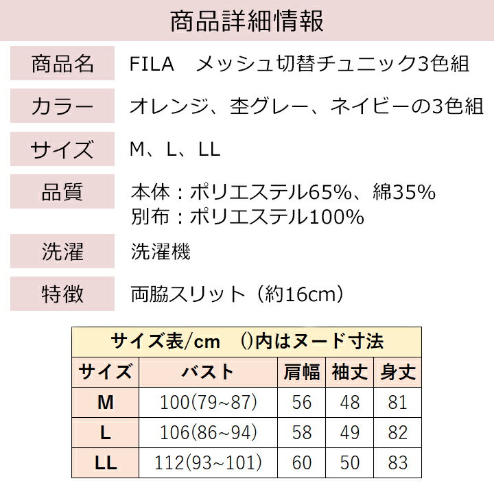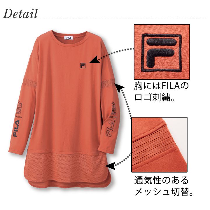 FILAメッシュ切替チュニック 3色組 [70176] レディースファッション レディース ファッション FILA フィラ メッシュ 切替 トップス チュニック ロンT ロング丈 Tシャツ オレンジ 杢グレー グレー ネイビー ロゴ ロゴT おしゃれ スポーツ ストリート