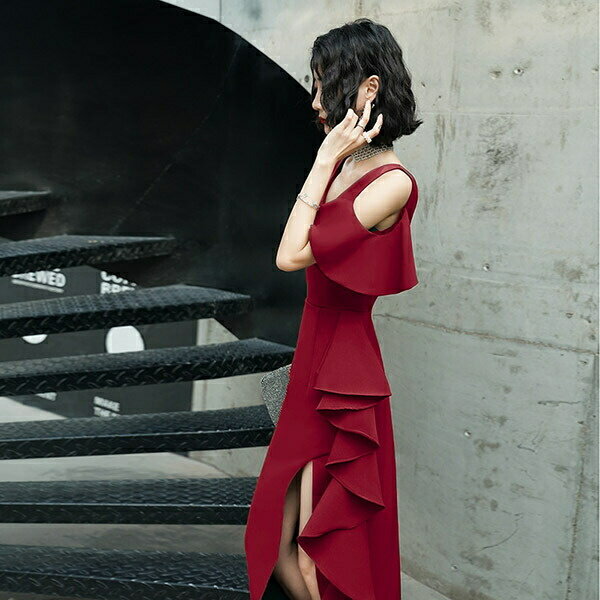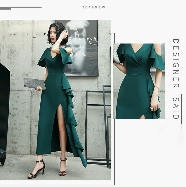 ロングドレス 発表会 演奏会 サイドスリット Vネック 肩出し 結婚式 母親 ドレス イブニングドレス フリル 背中開き カクテルドレス 緑 グリーン アシンメトリー 胸元セクシー 大きいサイズ パーディー用 XS S M L XL 2XL 3XL da034x1x1x1