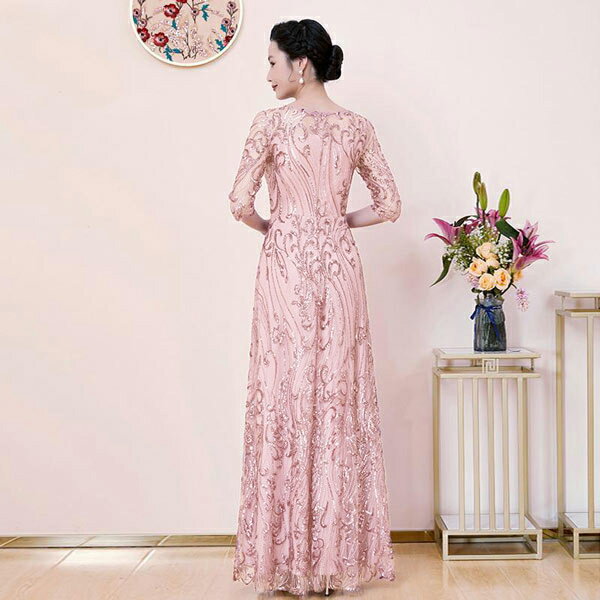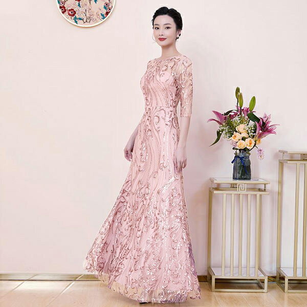 イブニングドレス ロングドレス カラオケドレス ピンク ステージドレス ラージサイズ L-5XL パーティードレス スパンコール衣装 ミセス 発表会 演奏会用ドレス ピアノ 合唱 披露宴 舞台衣装 お呼ばれ 結婚式 ad155c0c0m5