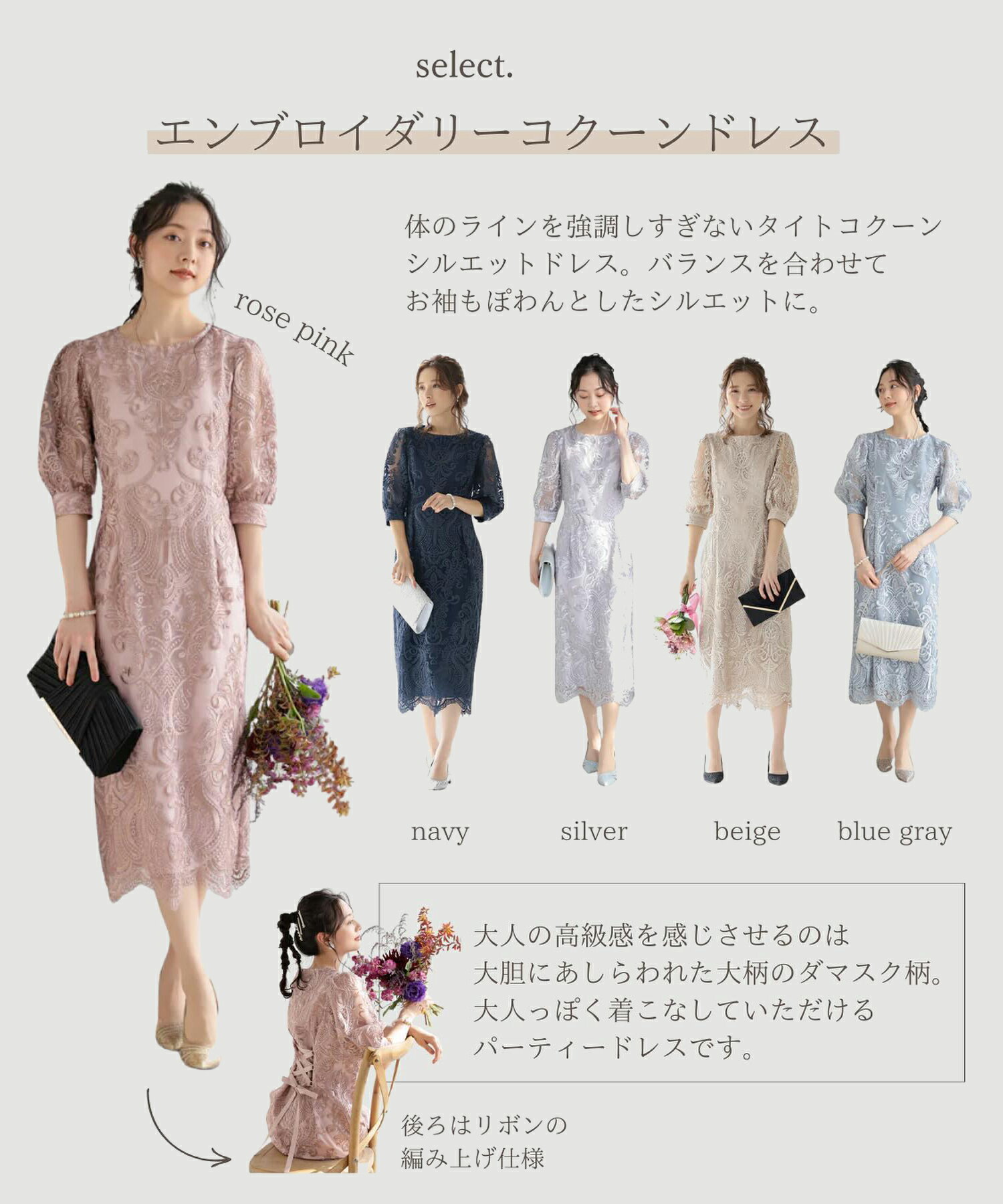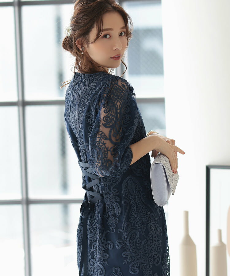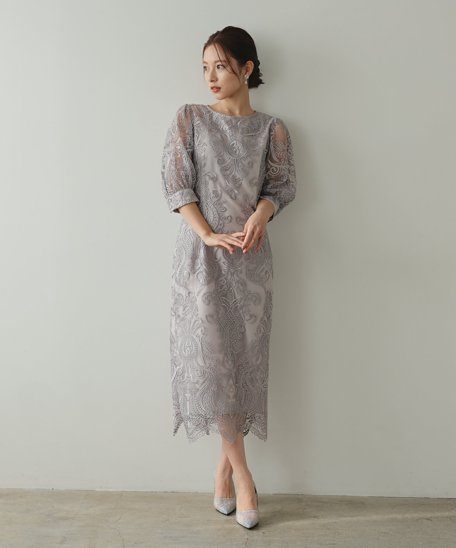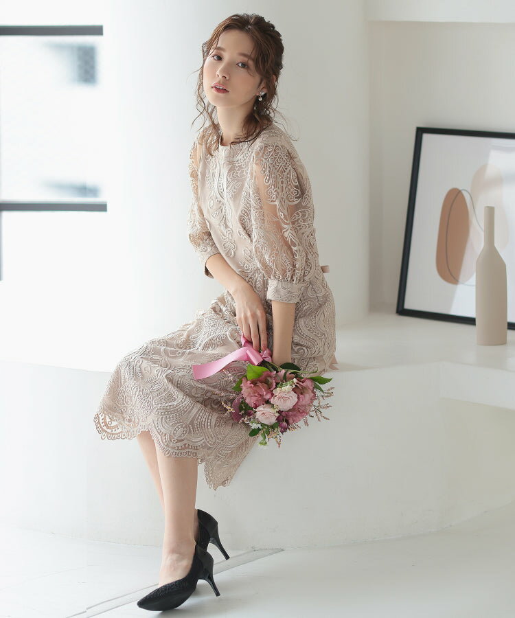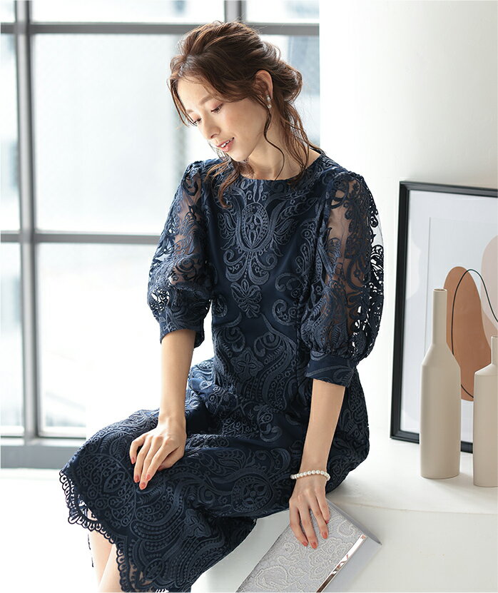 レースレディース ワンピース お見合い ダマスク柄 結婚式 お呼ばれ 服40代 女性 胸元 隠し ドレス パーティー オケージョン 3L 20代 ぽっちゃり 30代 親族 コクーン 黒 袖あり シルバー ネイビー ブルー グレー ベージュ ローズピンク s m l xl 4l haremode ハレモード 公式