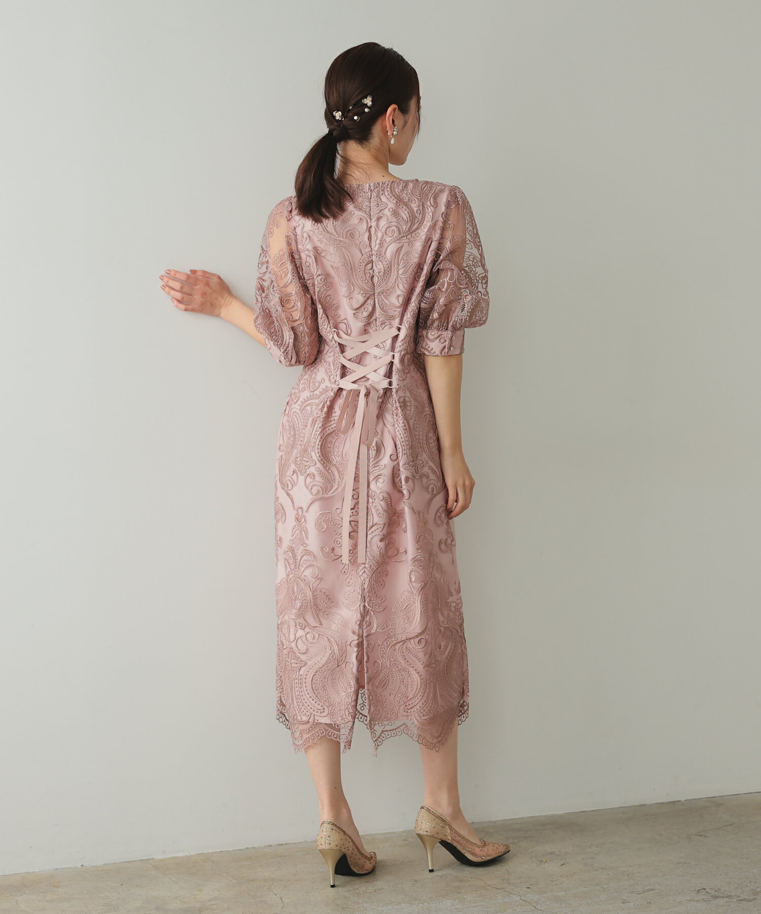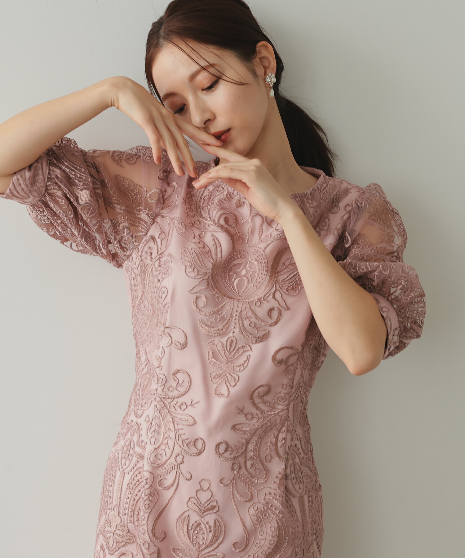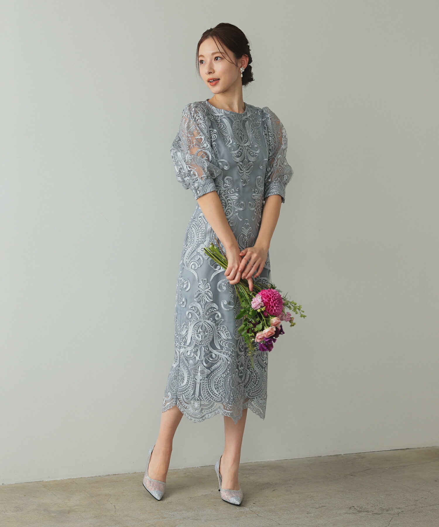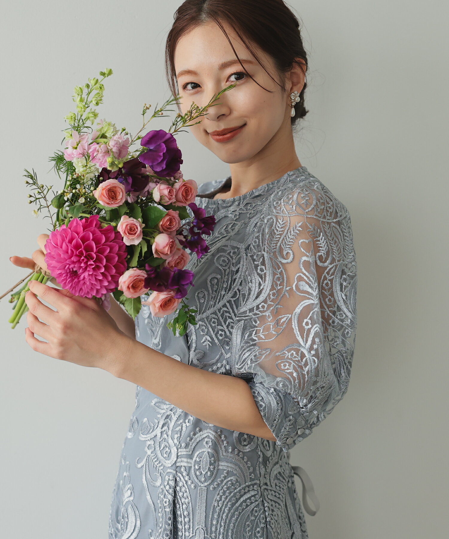レースレディース ワンピース お見合い ダマスク柄 結婚式 お呼ばれ 服40代 女性 胸元 隠し ドレス パーティー オケージョン 3L 20代 ぽっちゃり 30代 親族 コクーン 黒 袖あり シルバー ネイビー ブルー グレー ベージュ ローズピンク s m l xl 4l haremode ハレモード 公式